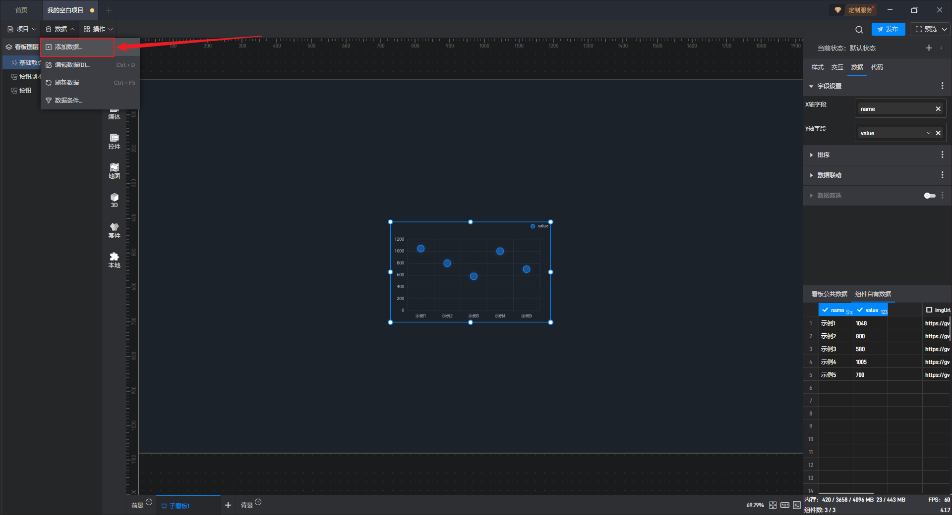 【温馨提示】如果您需要在本地数据源准备好之前制作项目,如制作一个原型图或 Demo,此时您可以直接使用组件自有数据。组件自有数据符合上述的组件数据源格式要求,但是不一定符合您的项目需求,所以您需要先对其进行修改才能使用。