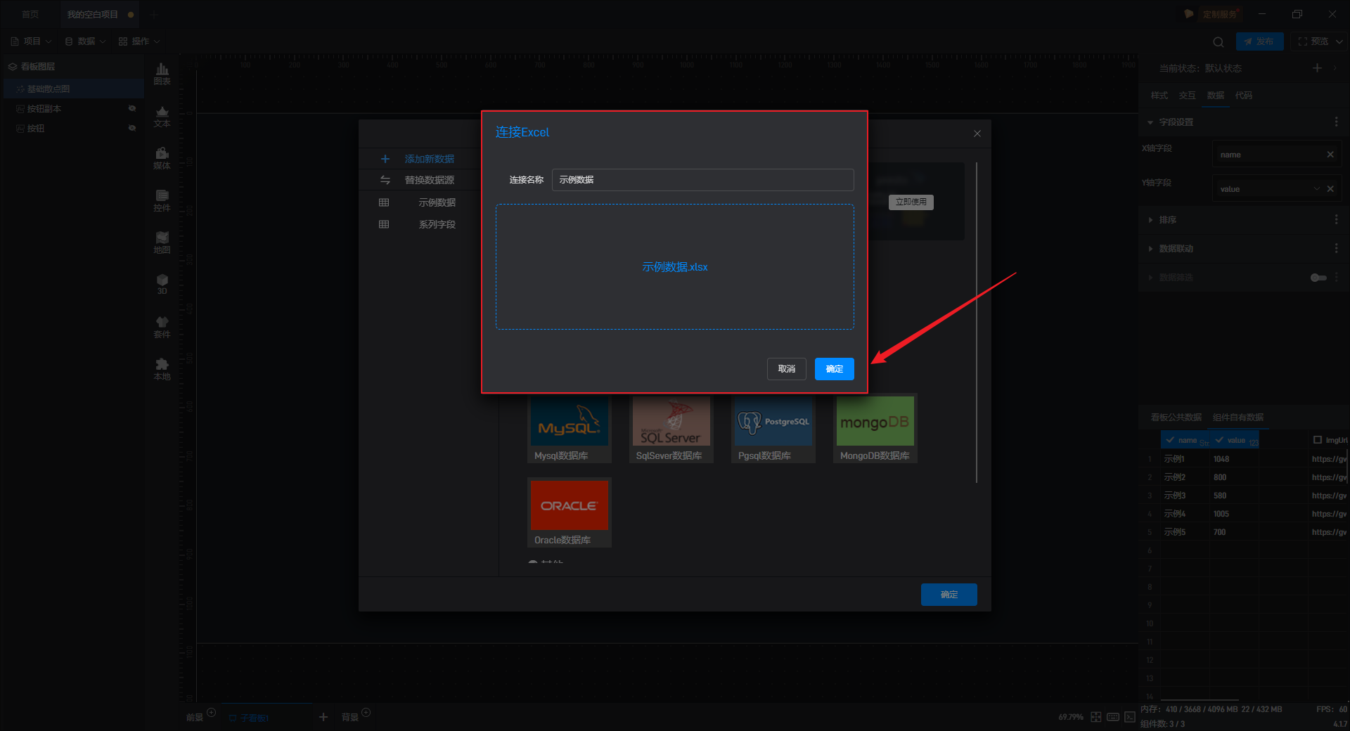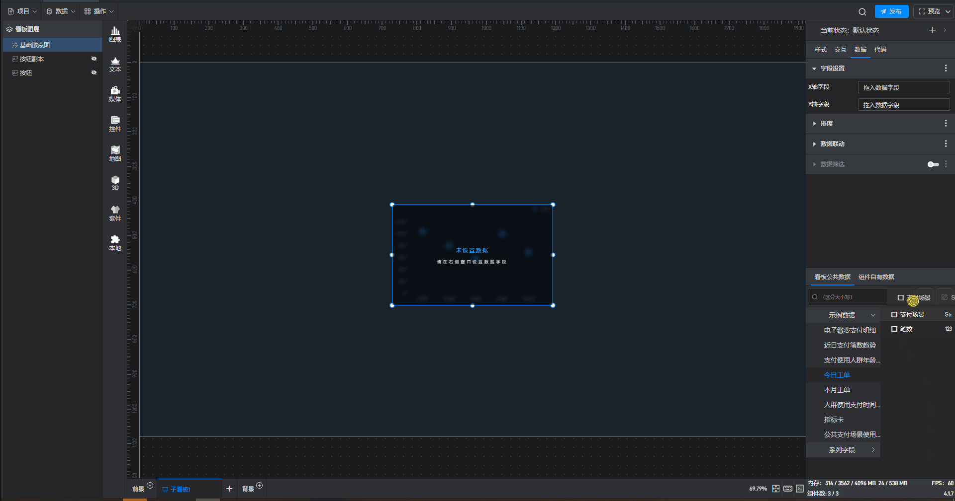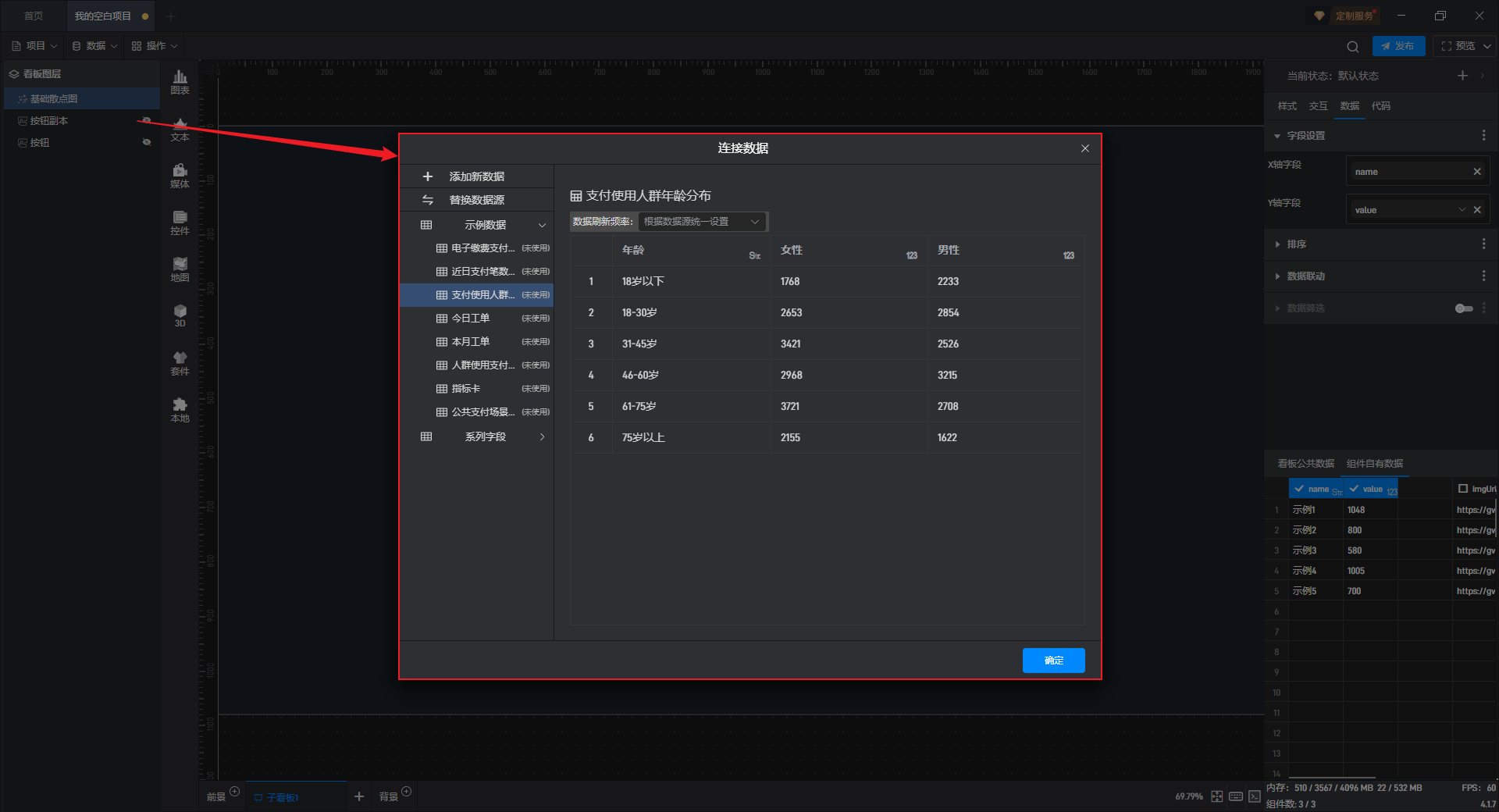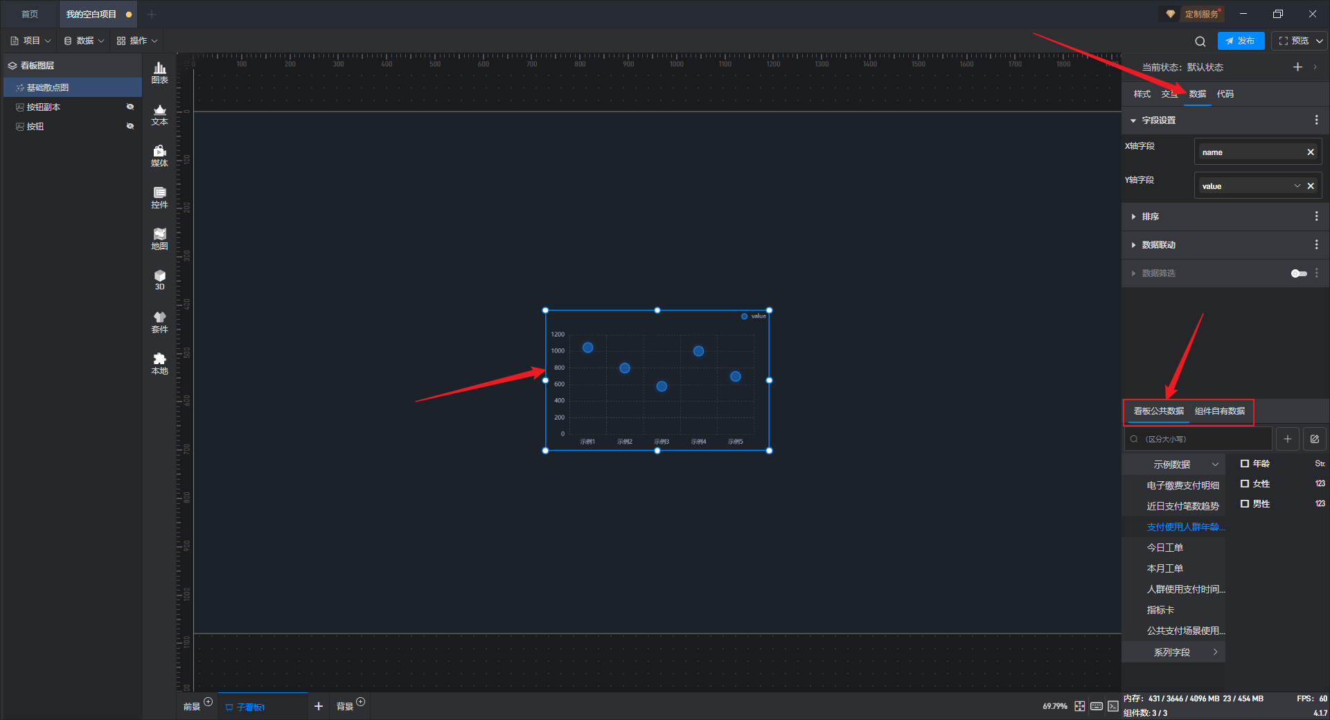 点击选中组件,在右侧“数据”设置窗口中切换到“看板公共数据”(同一个项目中所有数据源是共享的)。