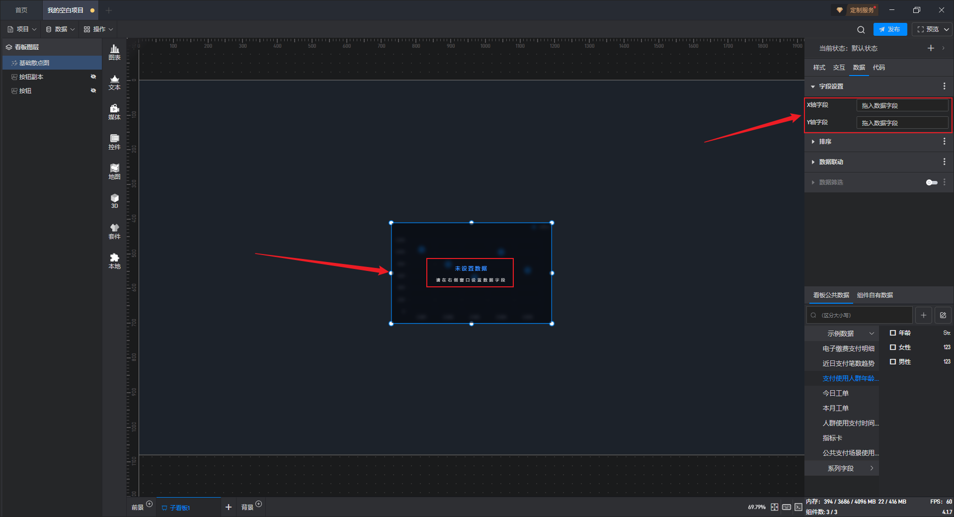 删除当前字段后,右侧字段栏为空,同时组件会提示“未设置数据”。