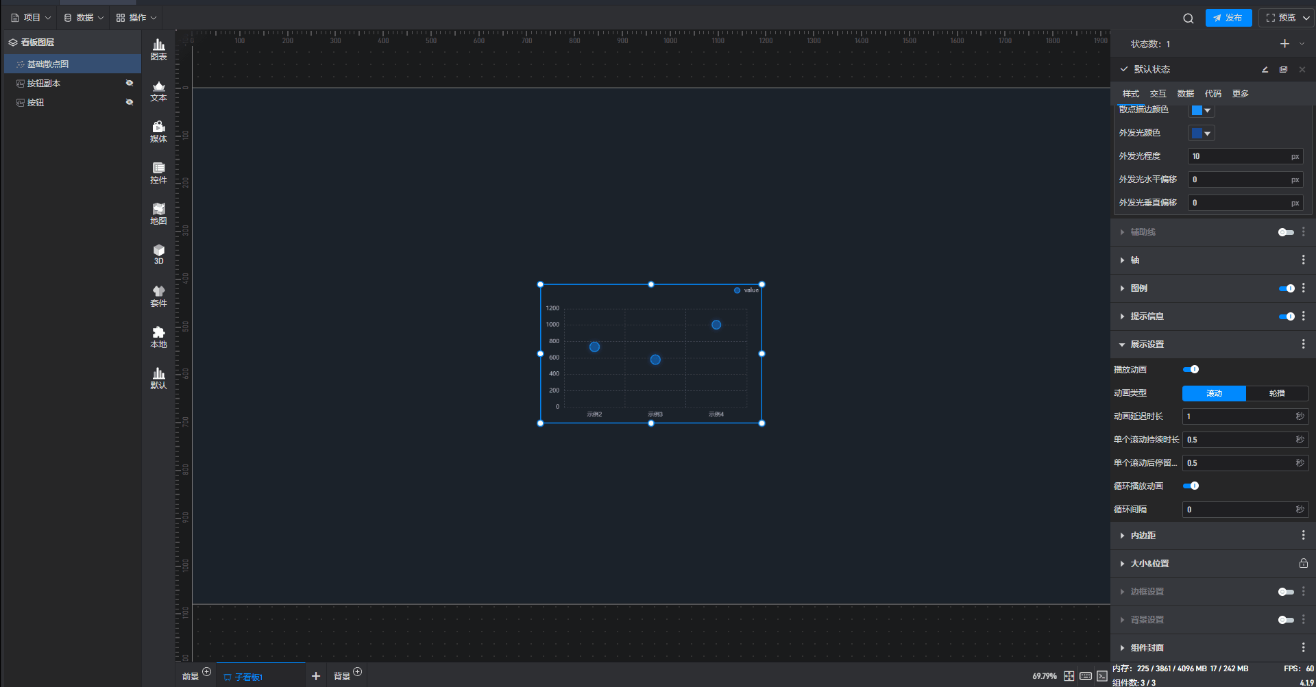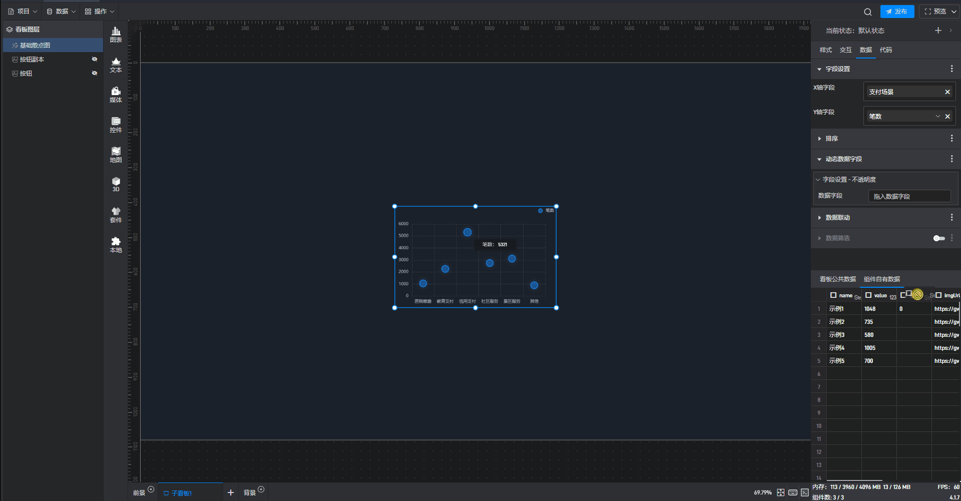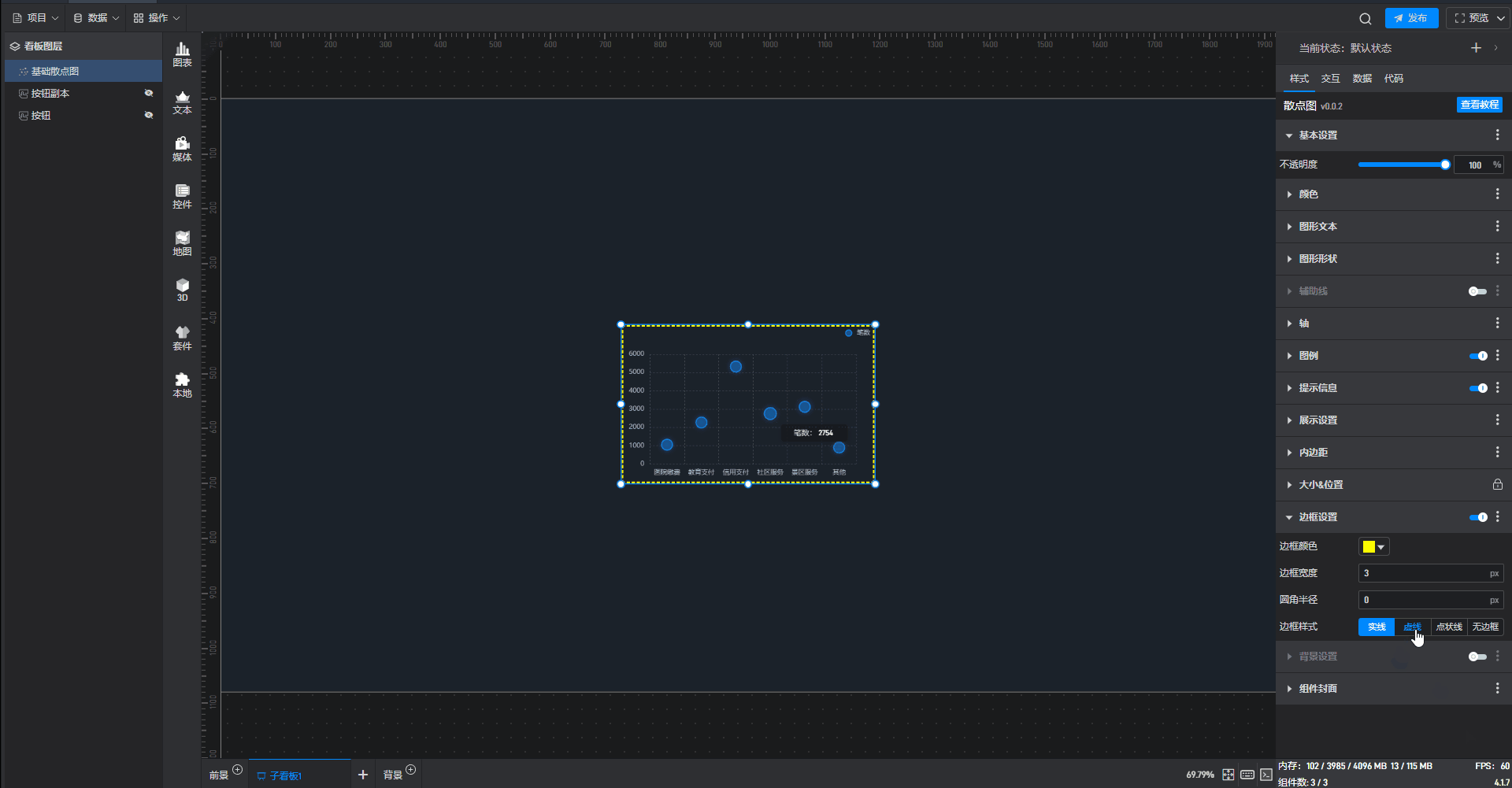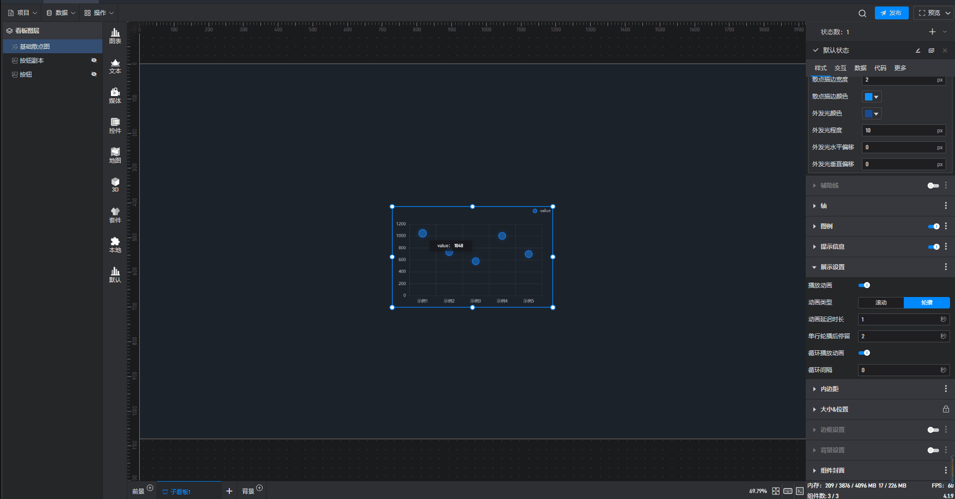 | 显示样式 | 选择“自适应”则组件根据图形大小自动显示点数量,选择“显示全部”则显示全部点数量,选择“自定义”可以自定义设置散点的数量和半径。 |