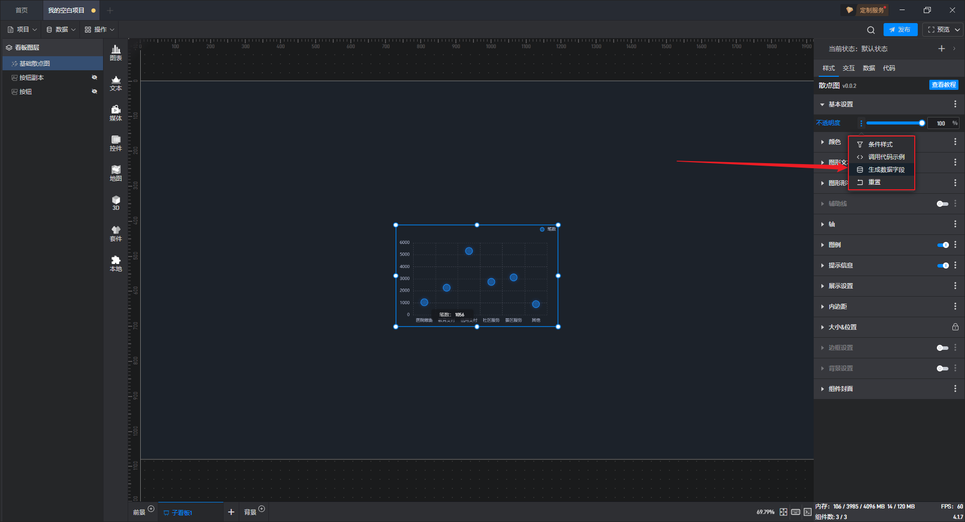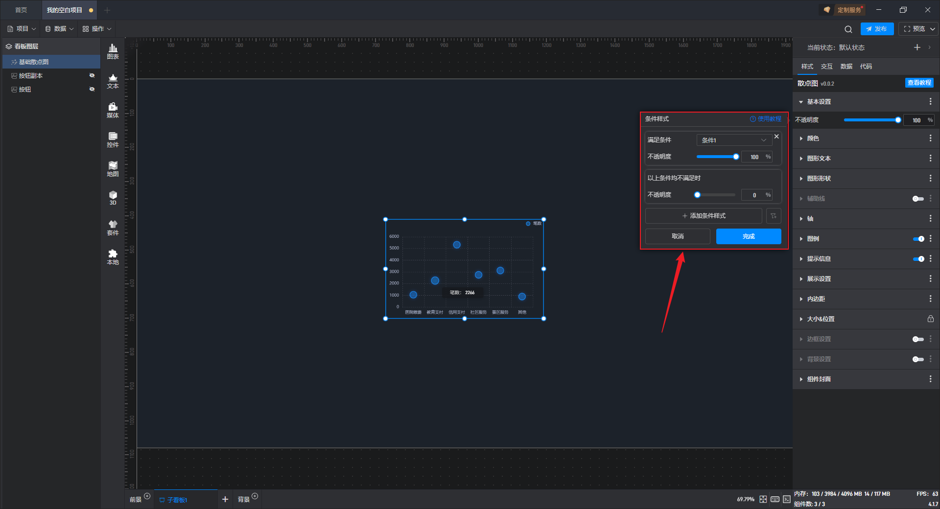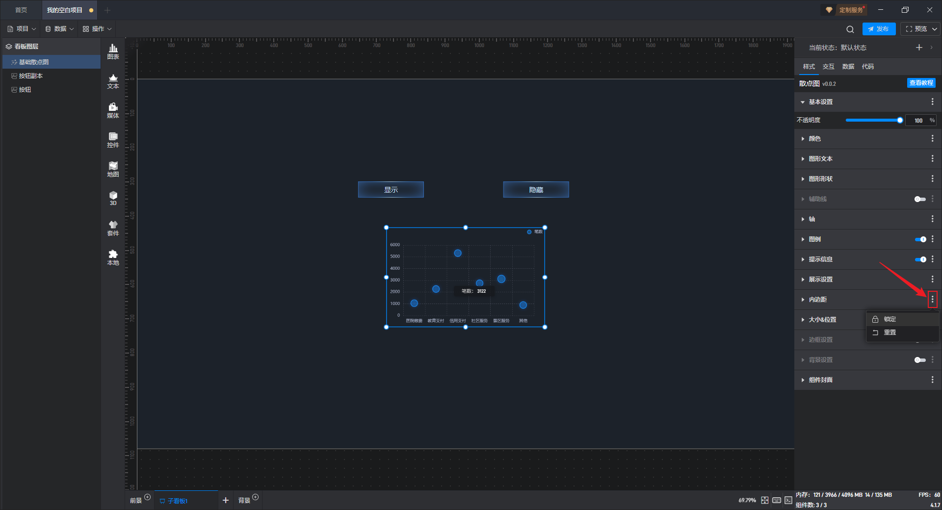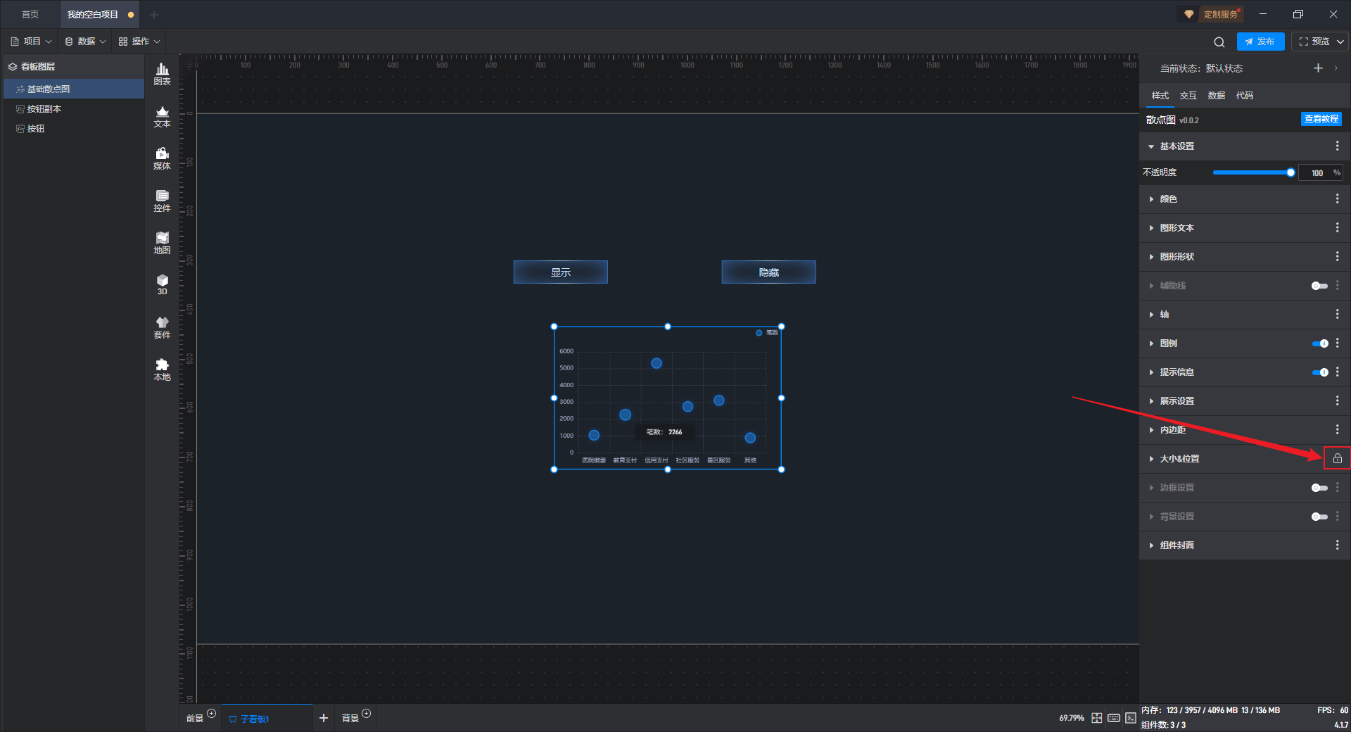 | 显示样式 | 选择“自适应”则组件根据图形大小自动显示点数量,选择“显示全部”则显示全部点数量,选择“自定义”可以自定义设置散点的数量和半径。 |