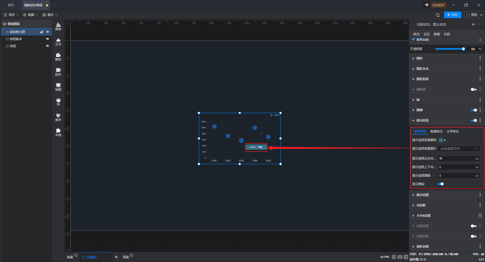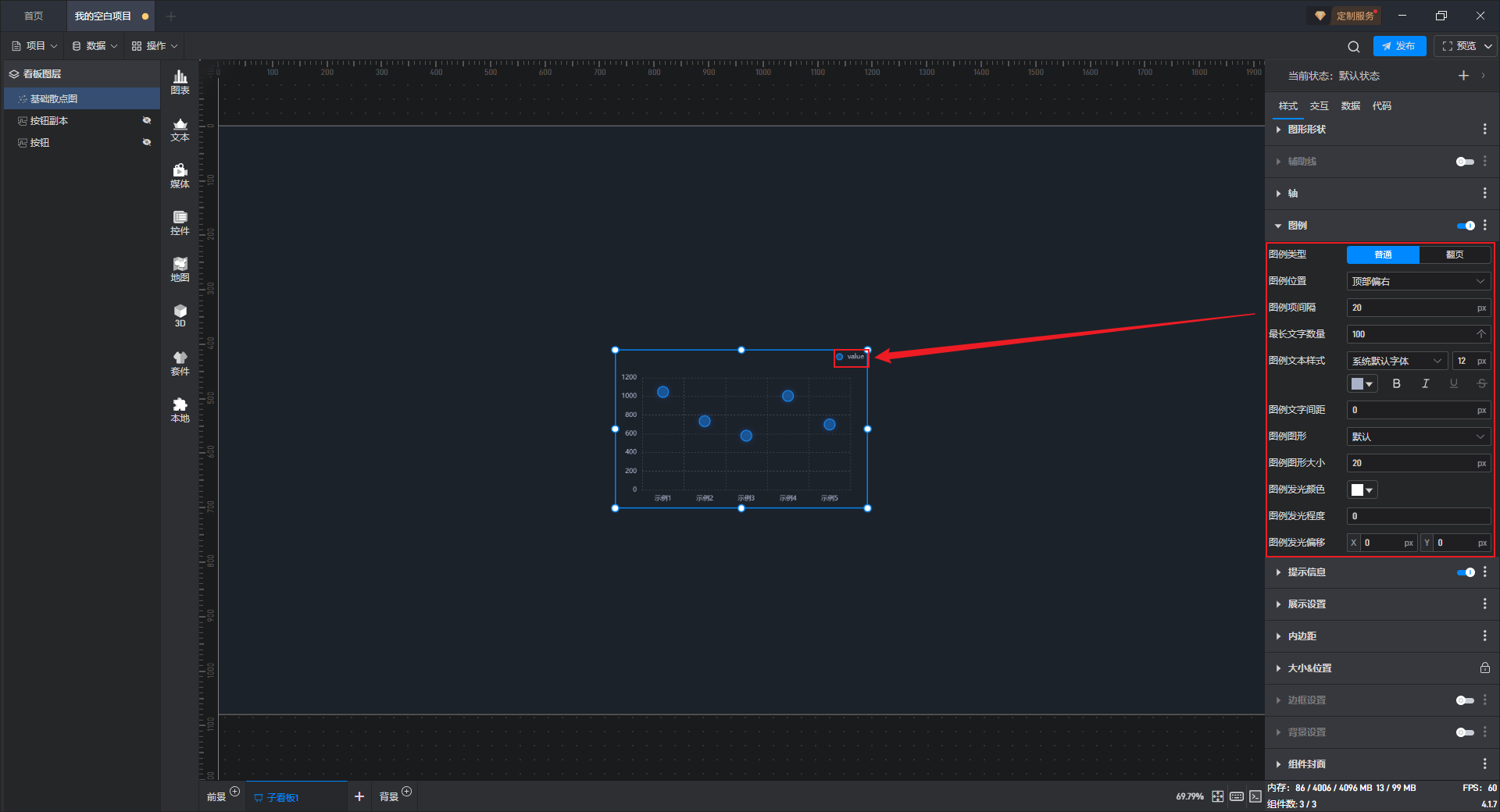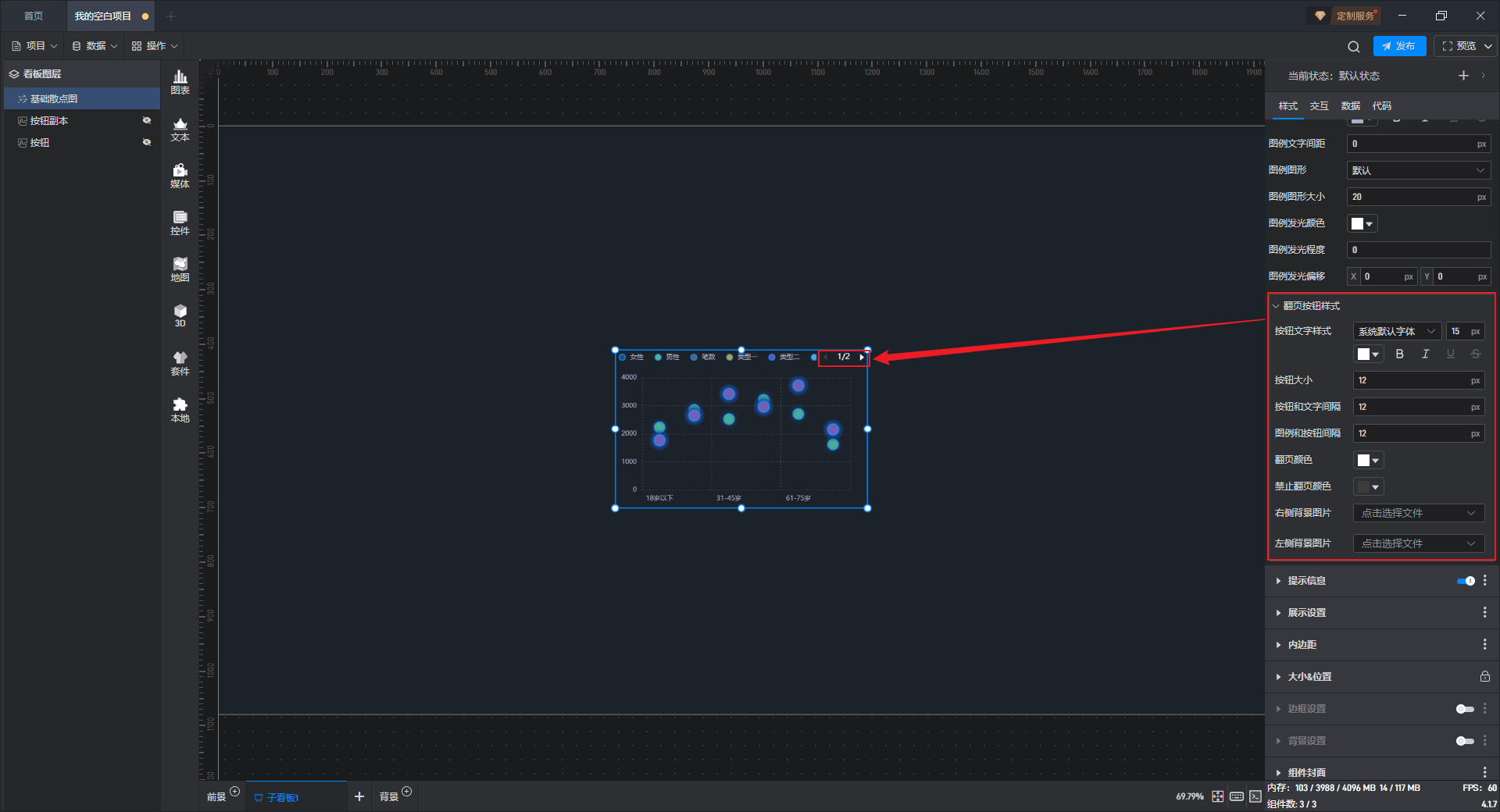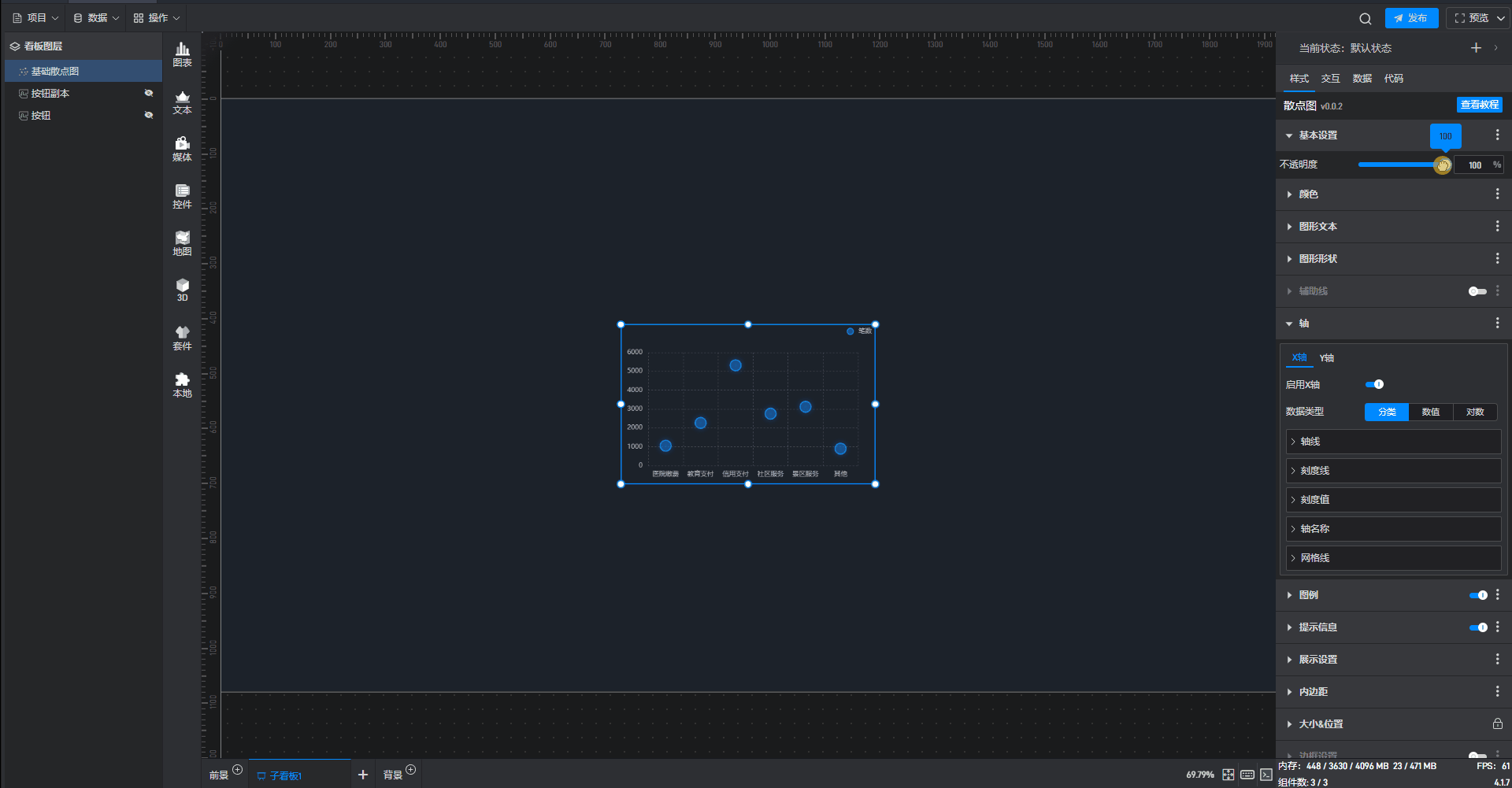 | 显示样式 | 选择“自适应”则组件根据图形大小自动显示点数量,选择“显示全部”则显示全部点数量,选择“自定义”可以自定义设置散点的数量和半径。 |