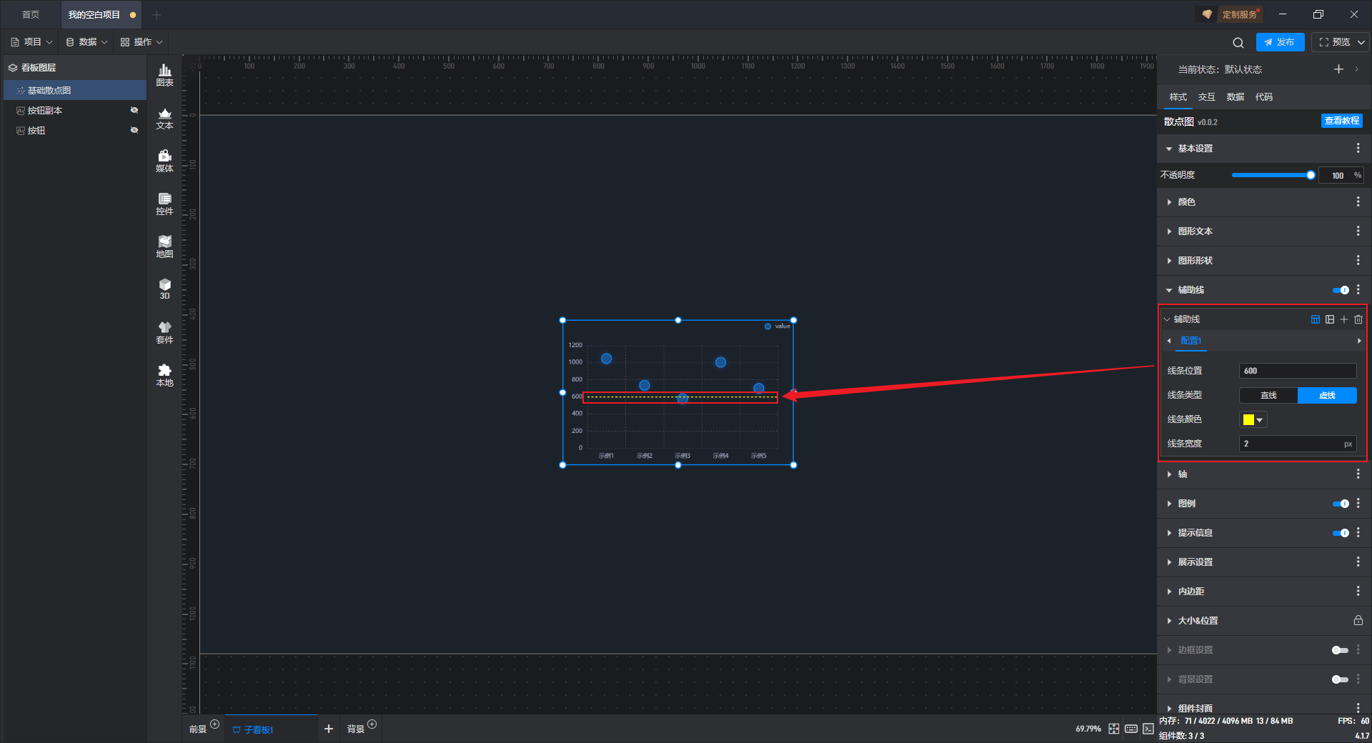 例如将辅助线线条位置设置为“600”,此时组件上会出现一条供参考的分界线,帮助我们查看以数据“600”为分界的数据分布形态。