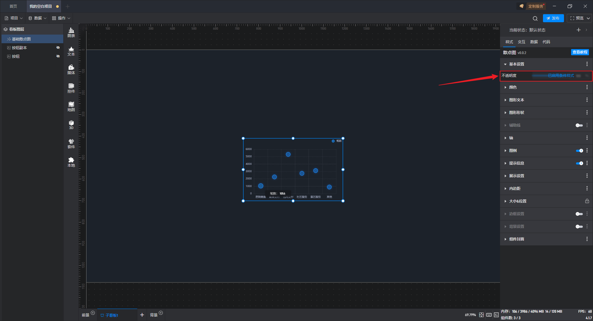 | 不透明度 | 1)根据个人喜好或整体和谐度合理地使用透明度,会让大屏布局更美观; | 2)这个设置项的一个常见用法是结合条件样式/交互/多状态来实现组件的显示和隐藏。 |