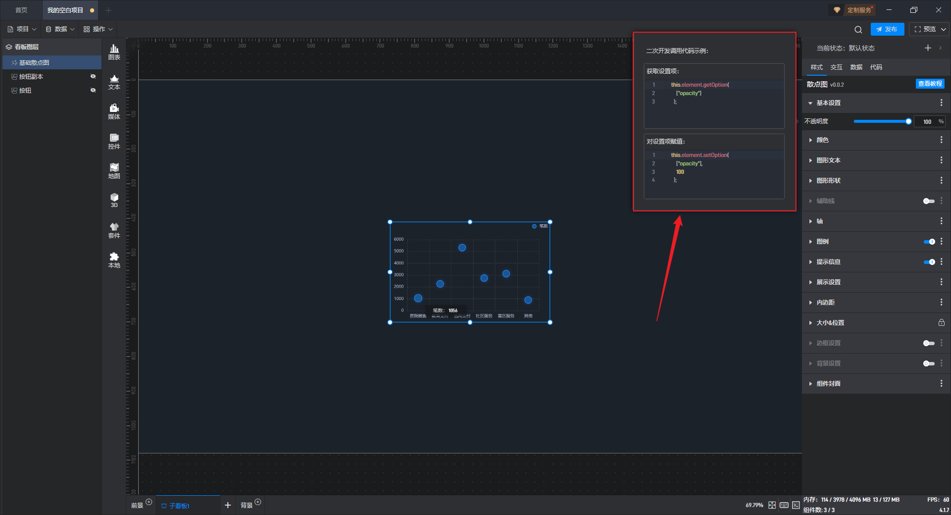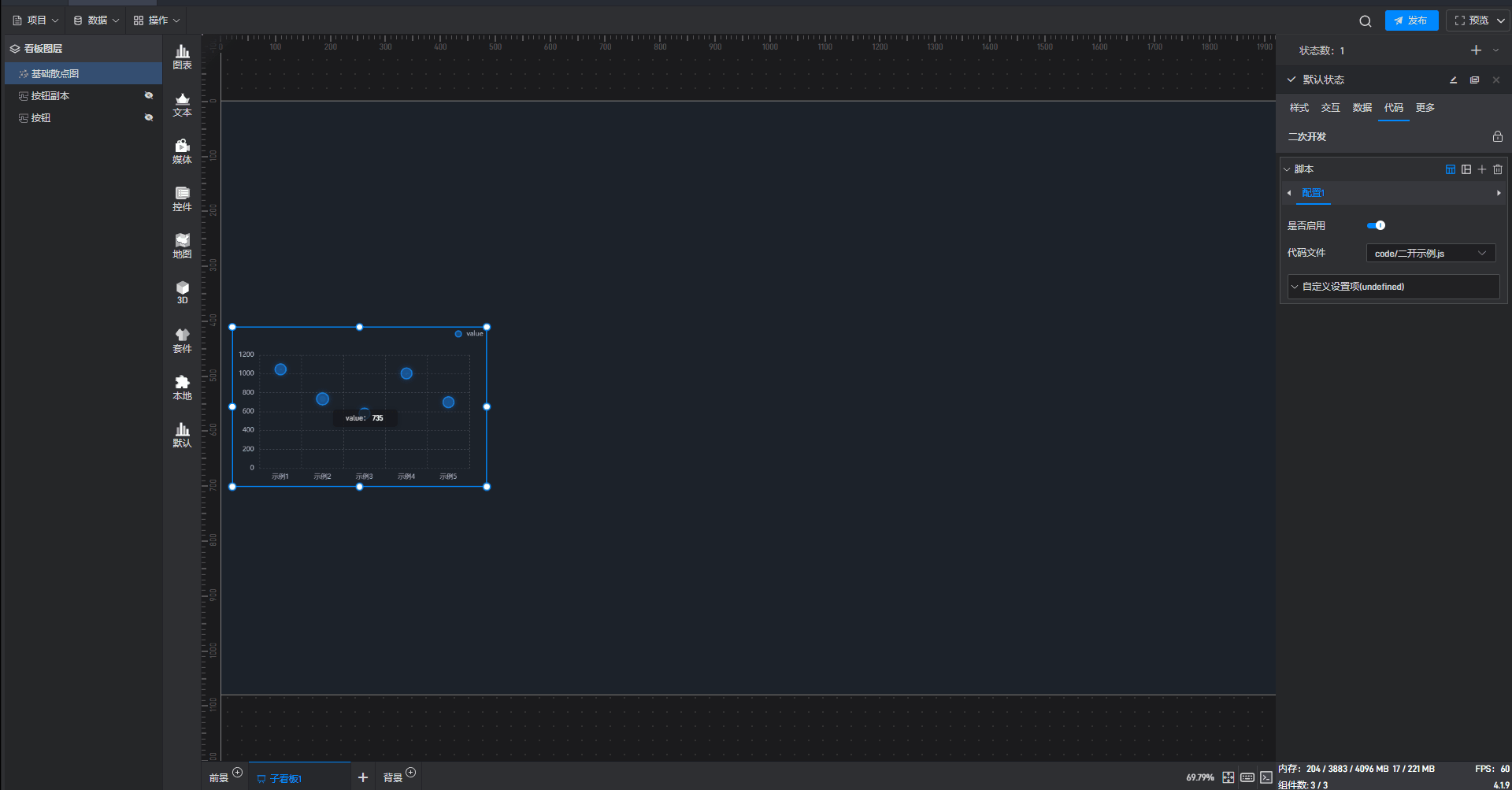点击选中组件,在右侧“代码”设置窗口中可以对组件进行二次开发设置。