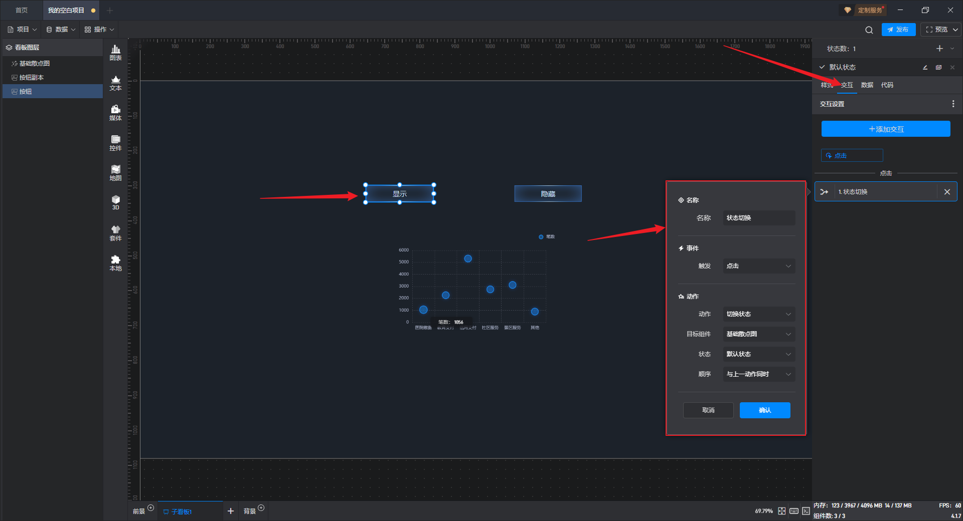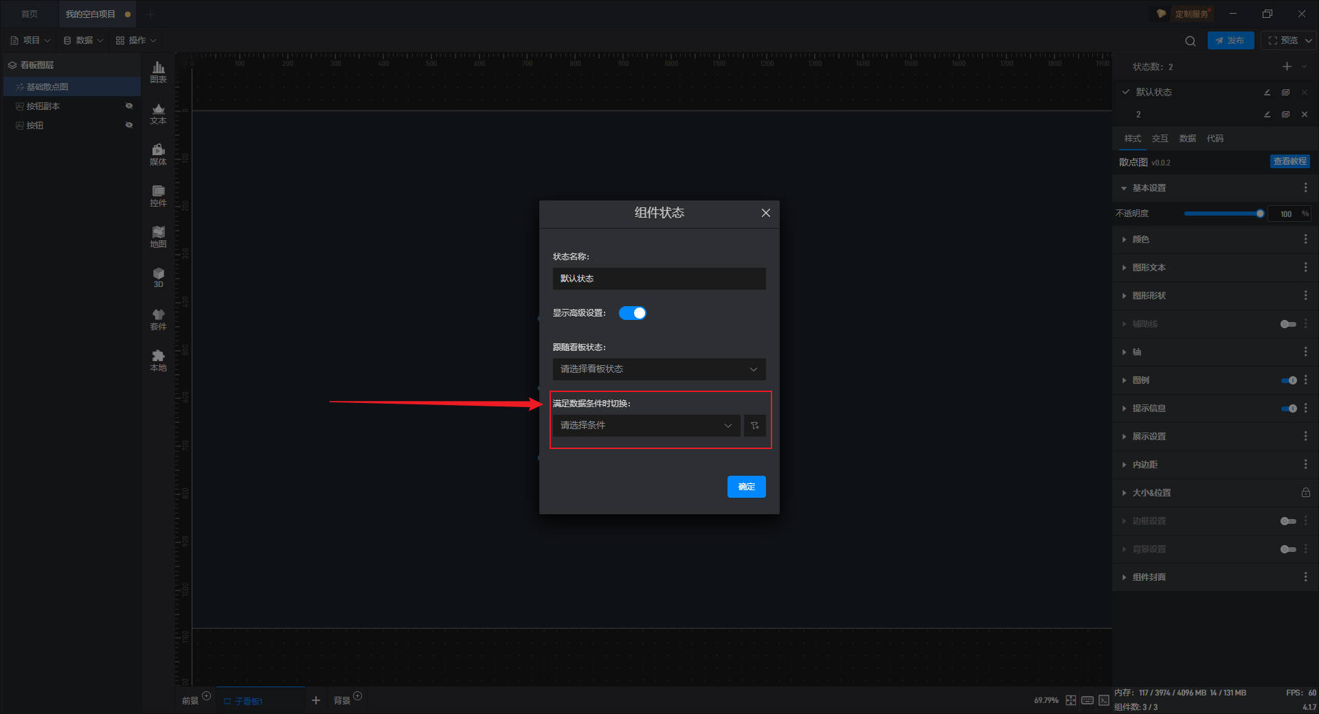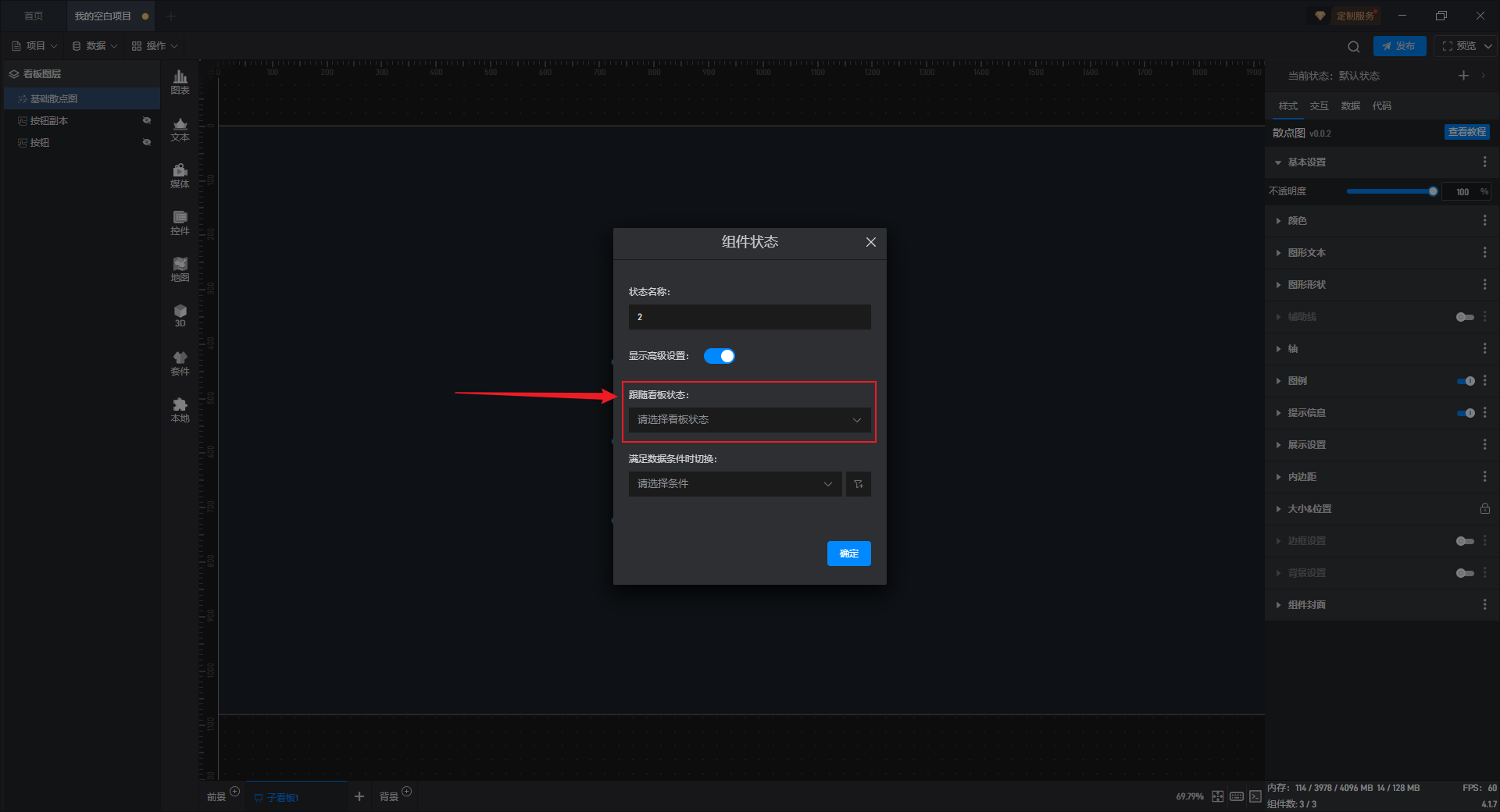 多状态主要用于通过数据条件或是点击交互(通常是点击其他组件来触发本组件的状态切换)来切换组件设置项的场景,这里的设置项包括组件的样式、交互、数据和代码。