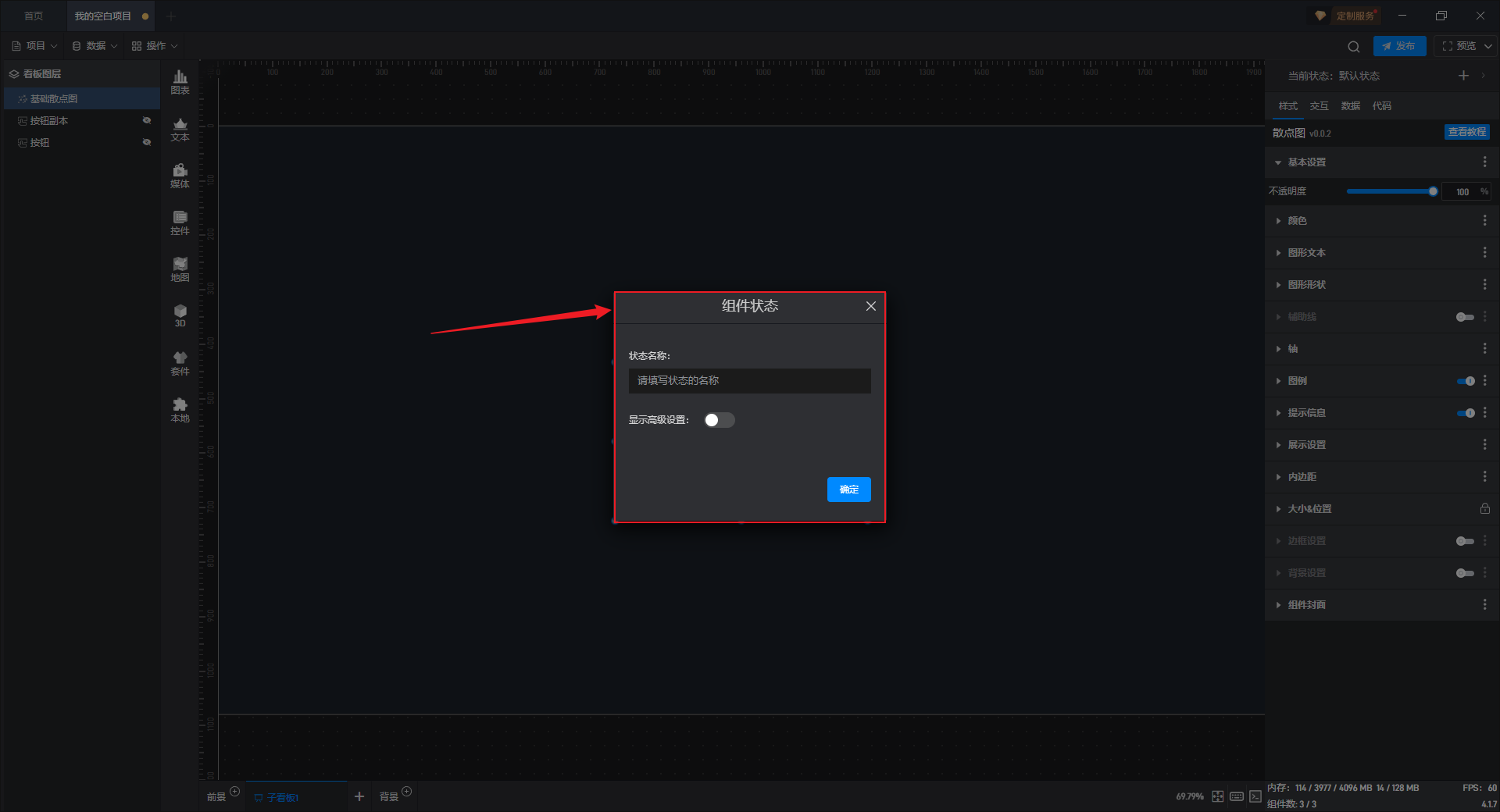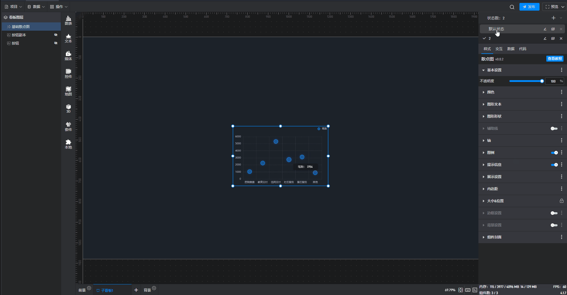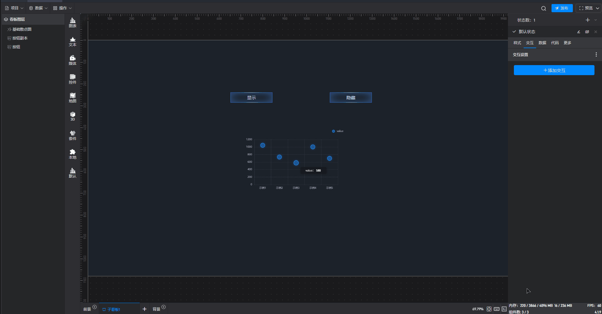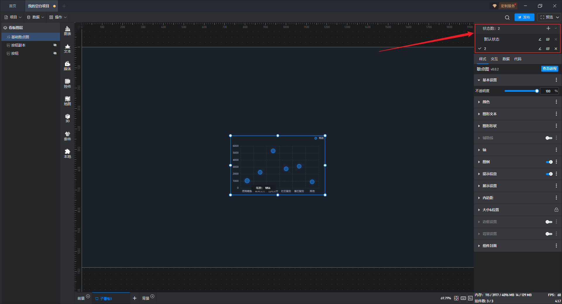 多状态主要用于通过数据条件或是点击交互(通常是点击其他组件来触发本组件的状态切换)来切换组件设置项的场景,这里的设置项包括组件的样式、交互、数据和代码。