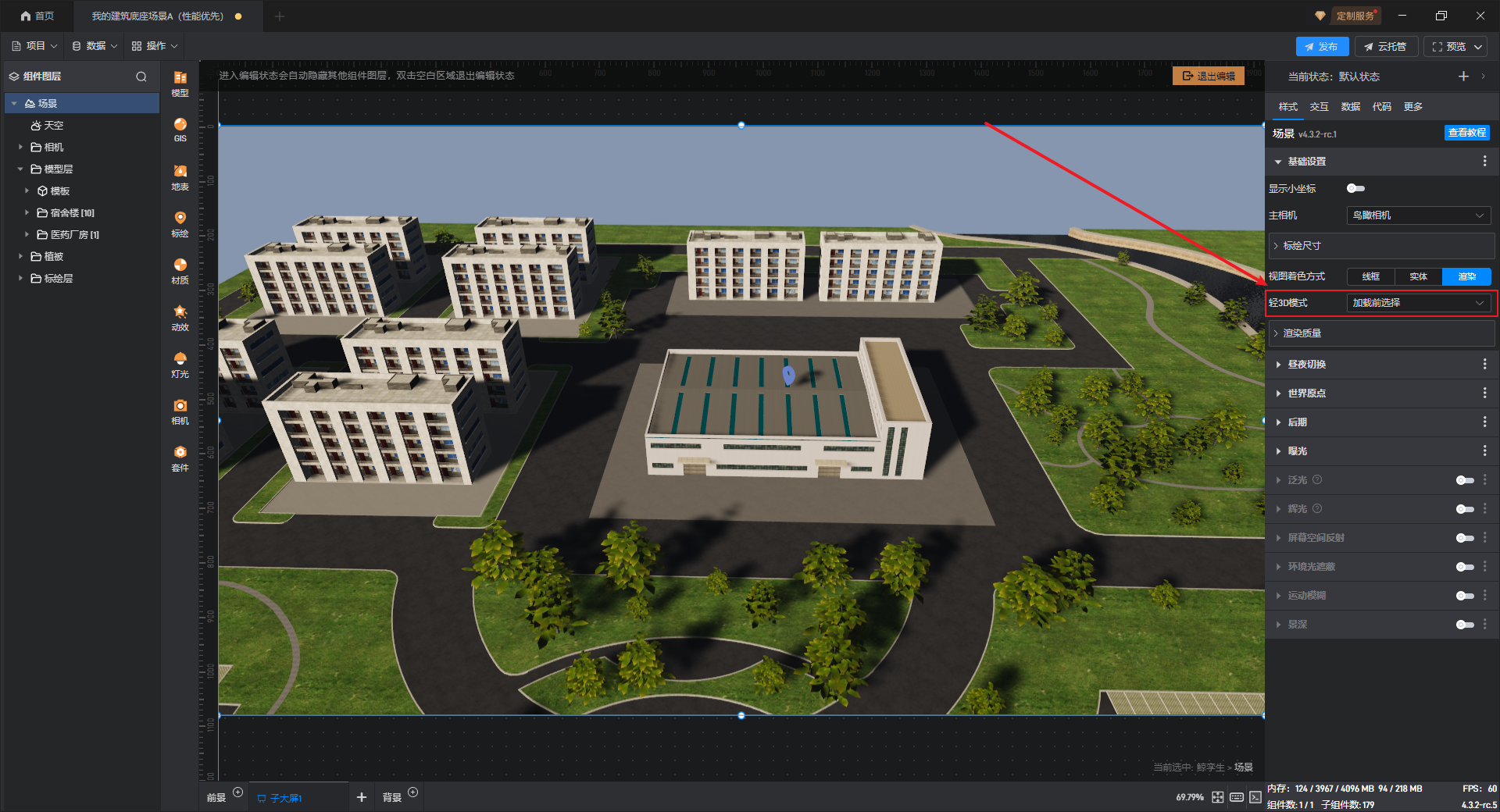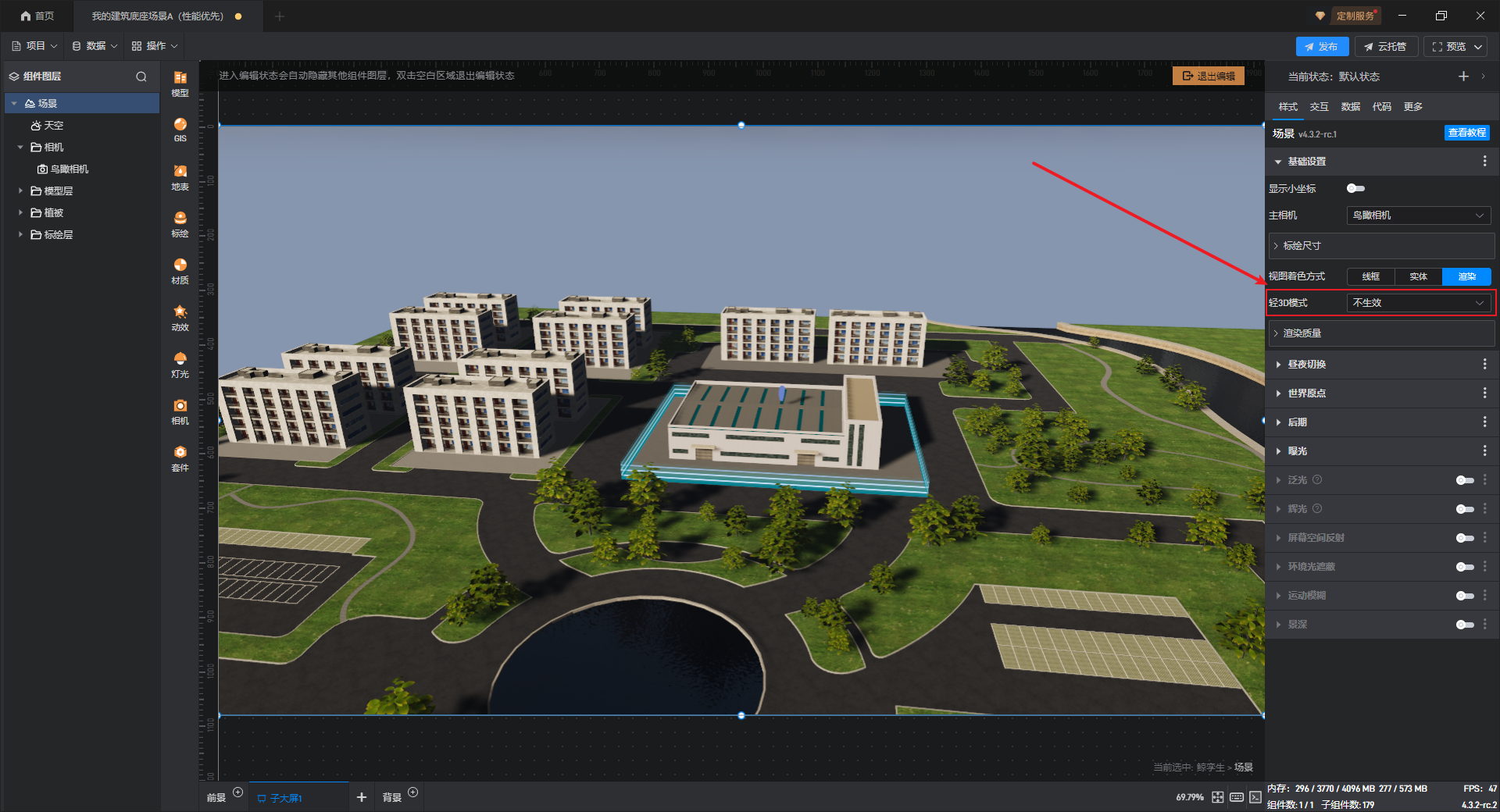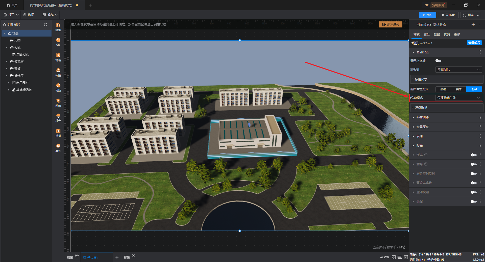 轻 3D 模式一共有五种,分别是:不生效、生效、仅移动端生效、加载前选择、根据性能选择,下面使用“鸟瞰相机”进行逐一演示,由于同一种轻 3D 模式在软件内和发布后的 Web 端的效果是相同的,所以这里只展示 Web 的具体效果: