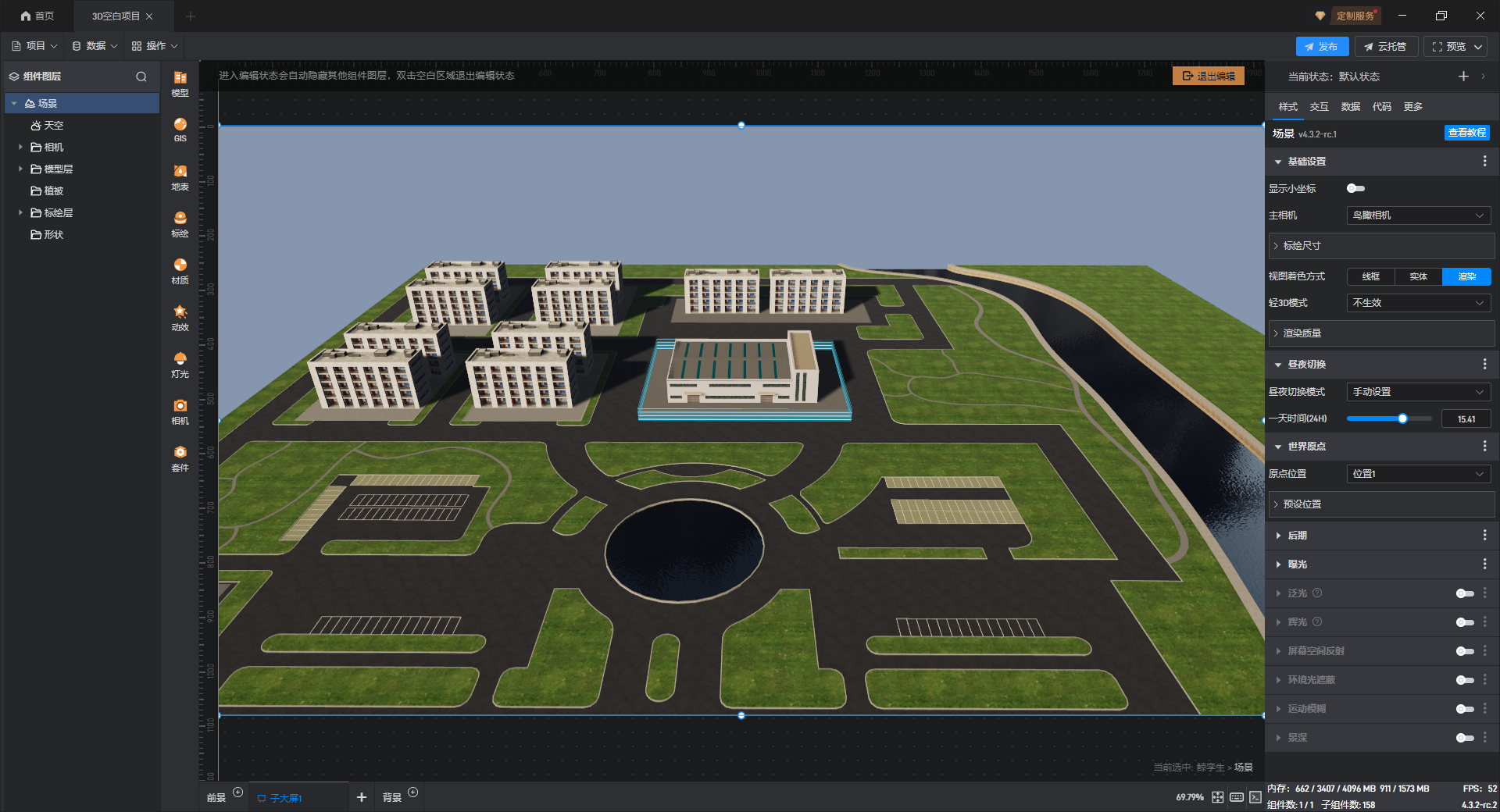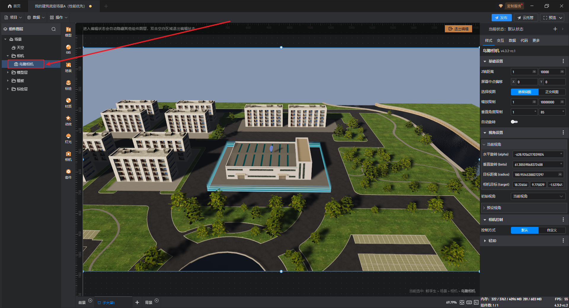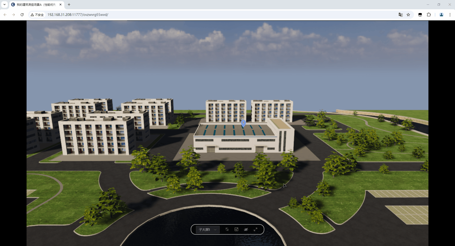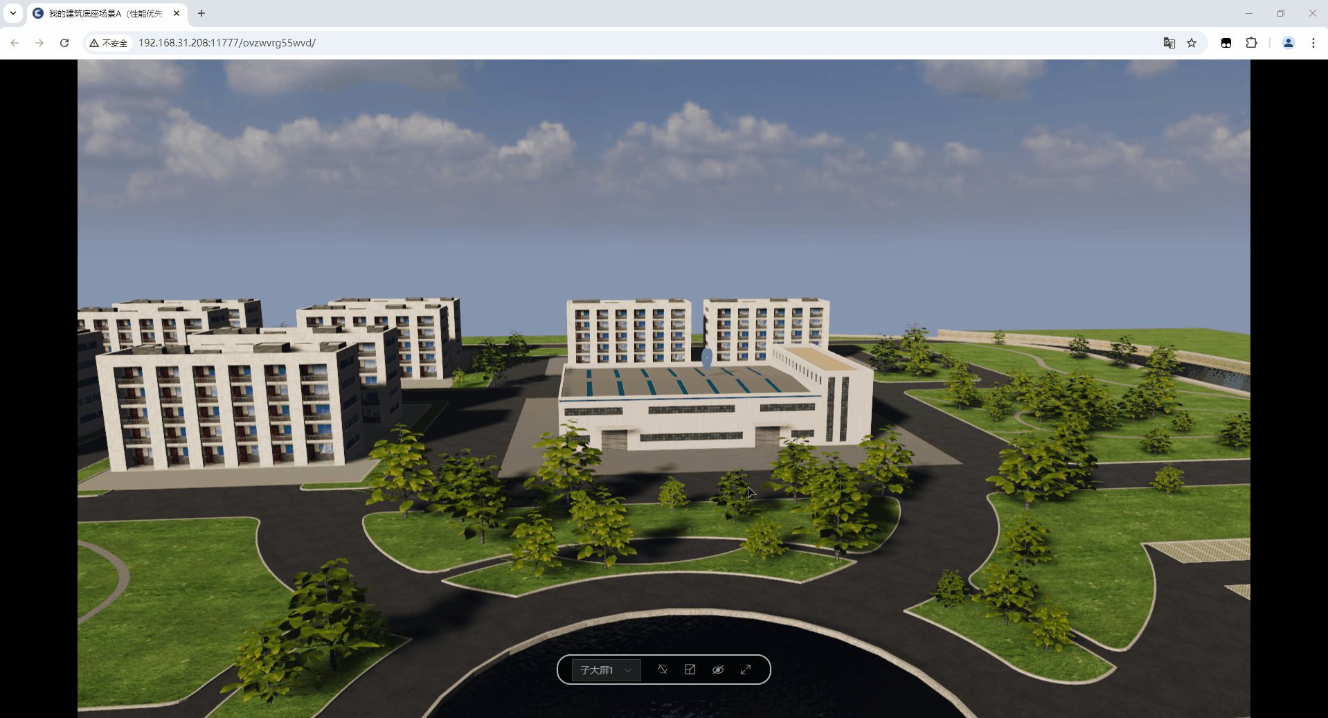 轻 3D 模式一共有五种,分别是:不生效、生效、仅移动端生效、加载前选择、根据性能选择,下面使用“鸟瞰相机”进行逐一演示,由于同一种轻 3D 模式在软件内和发布后的 Web 端的效果是相同的,所以这里只展示 Web 的具体效果: