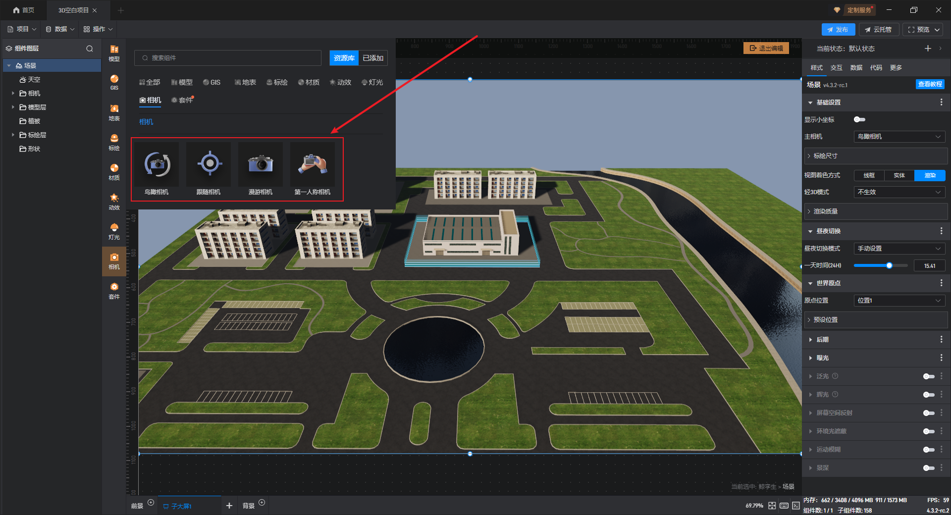 在创建鲸孪生组件时,会默认生成一个“鸟瞰相机”,点击组件图层中的“相机”即可看到。