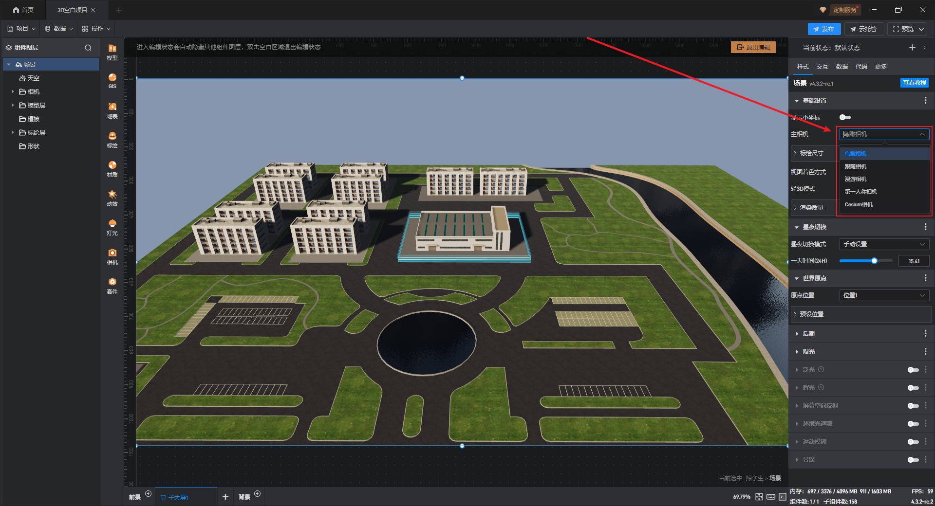 在组件图层中选中“场景”图层,在“样式-基础设置”中选择主相机,如下图所示:
