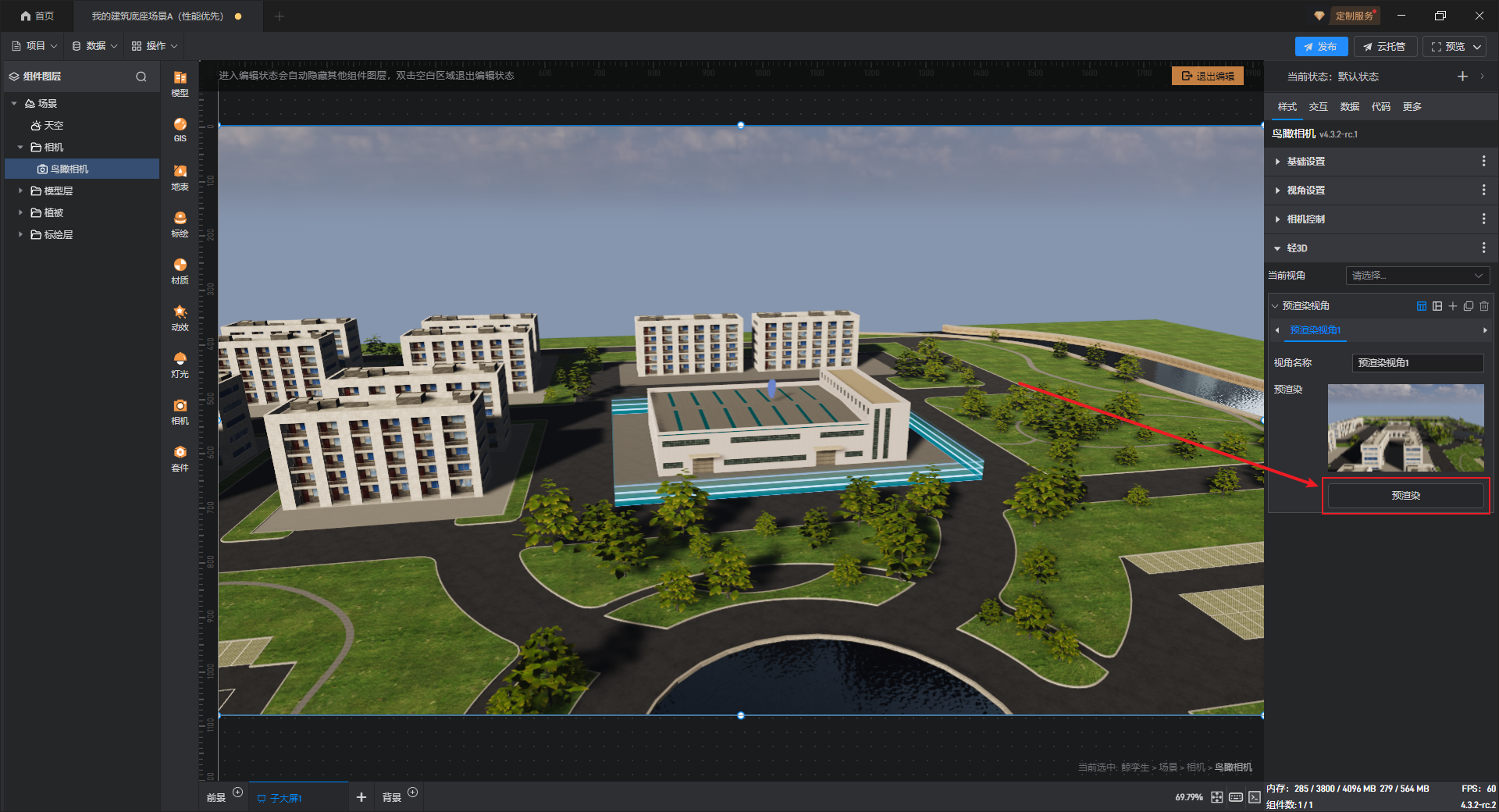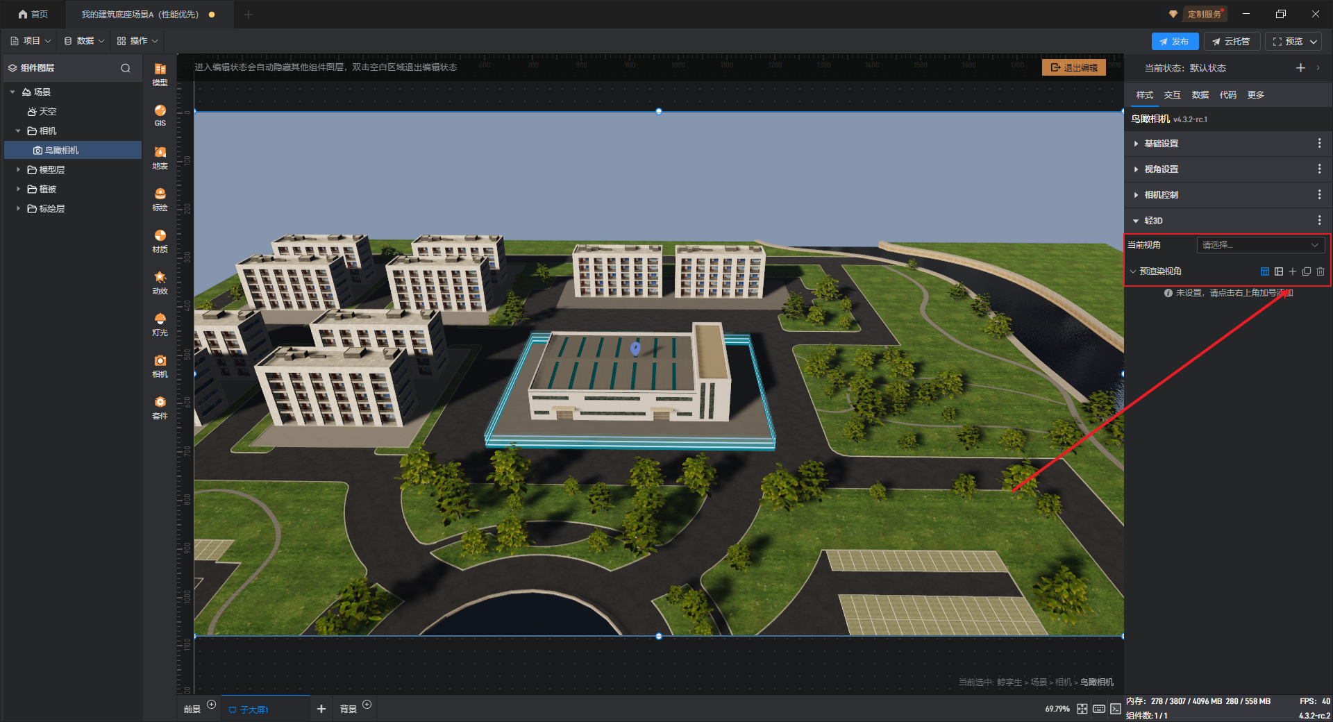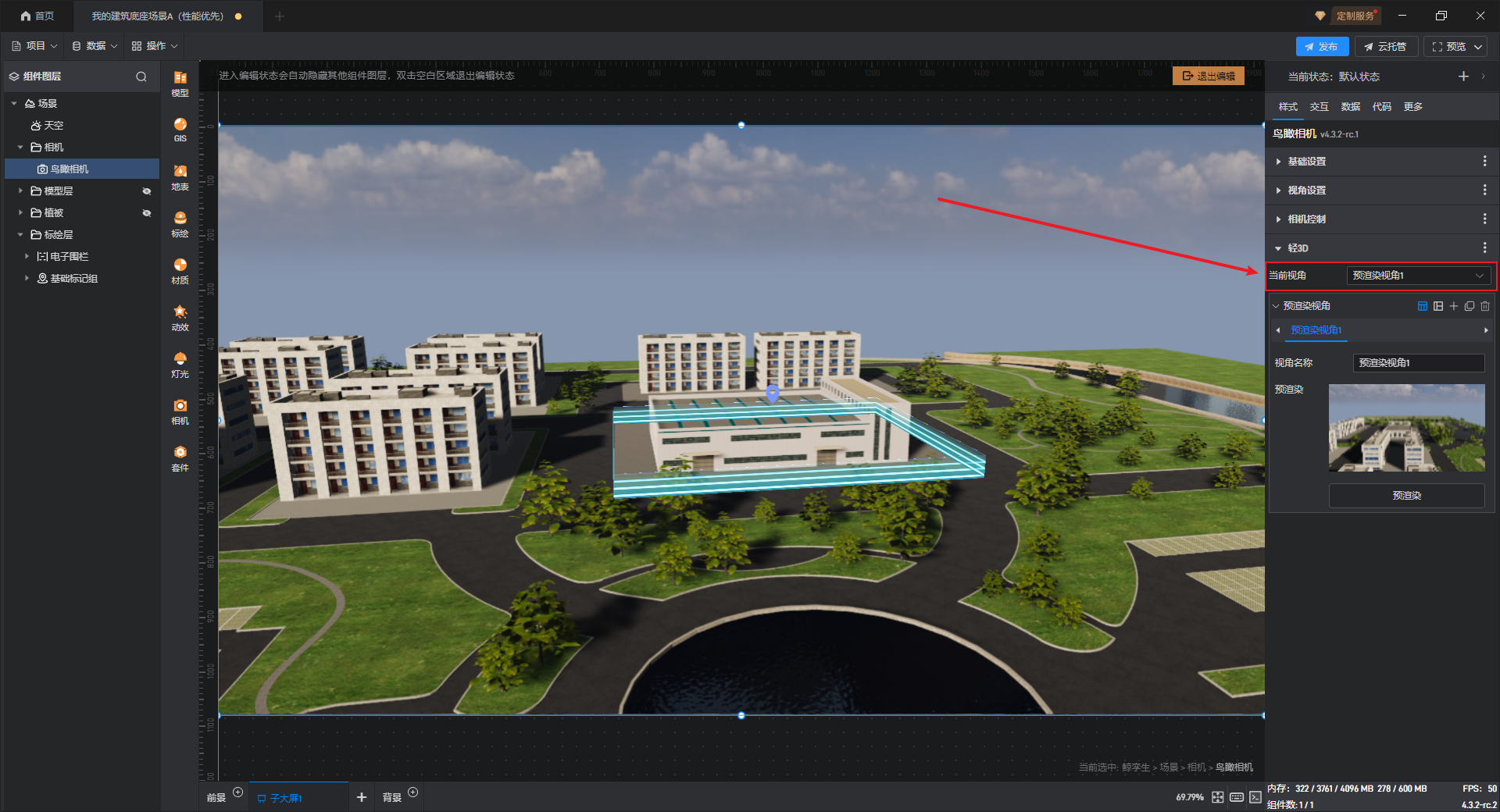 在组件图层中选择“鸟瞰相机”,在轻 3D 设置项中,将“当前视角”设置为提前预渲染过的“预渲染视角 1”,此时会使用预渲染的二维图片来完整地呈现整个项目,如下图所示: