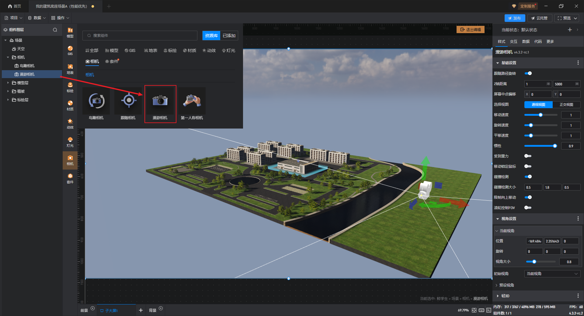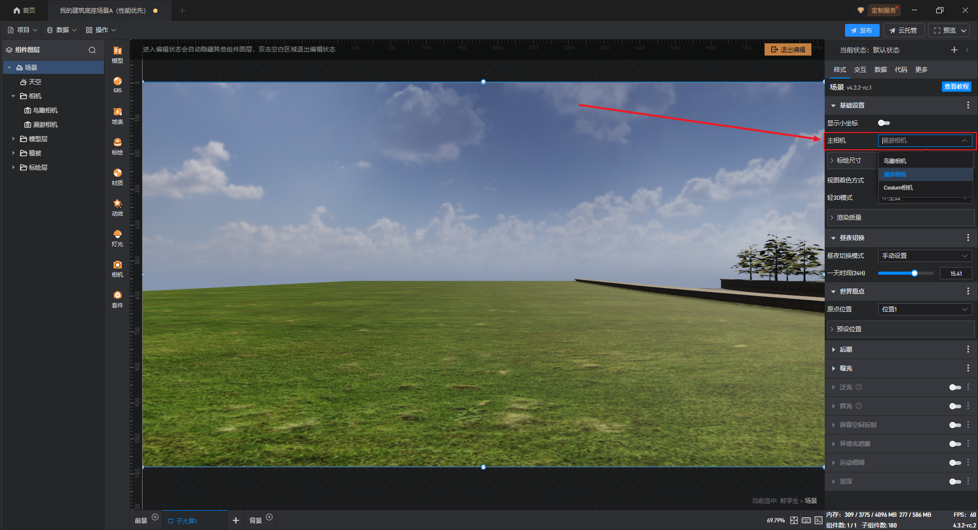 在组件图层中选中“场景”图层,在“样式-基础设置”中将主相机设置为“漫游相机”,如下图所示: