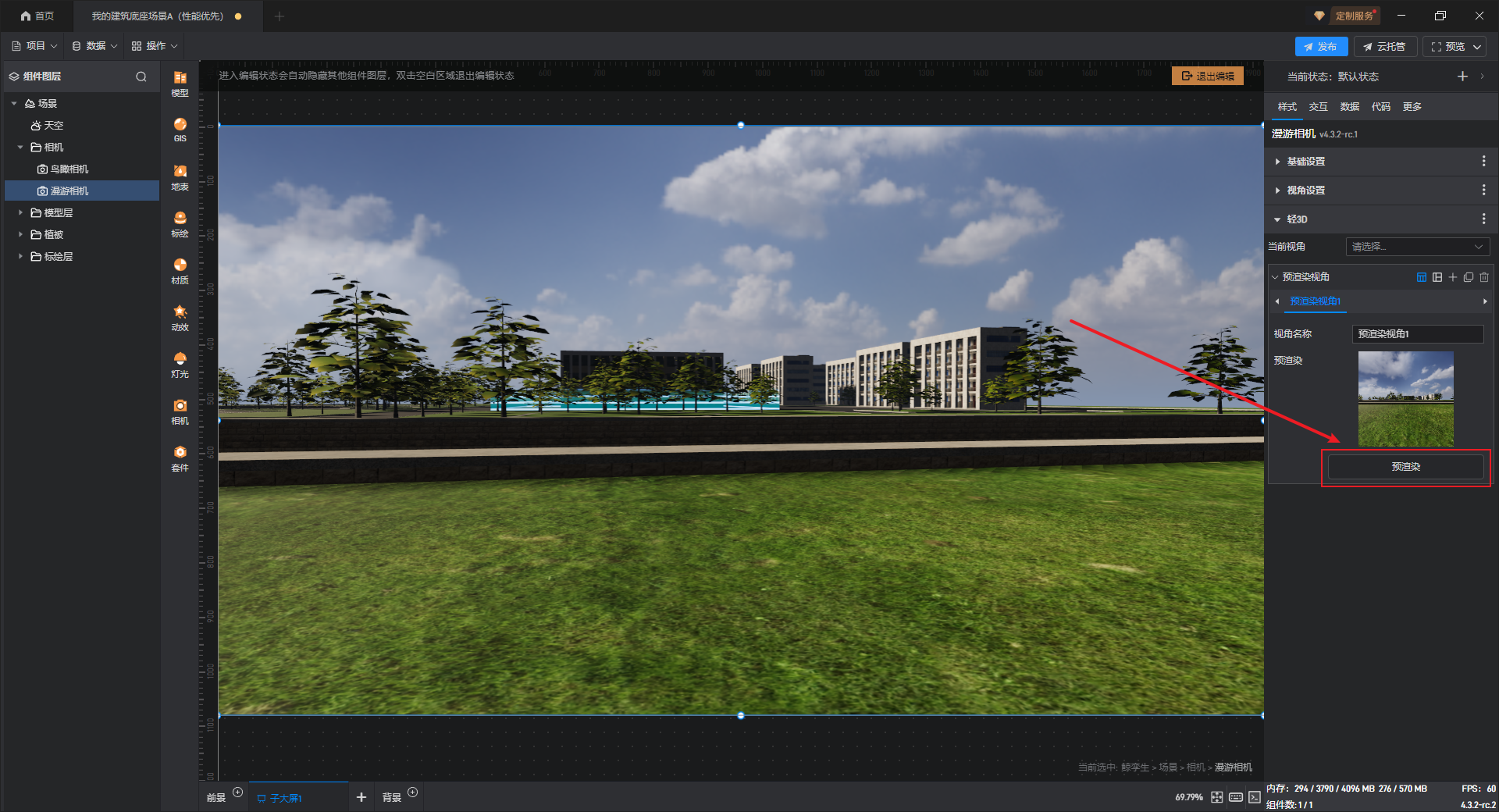 选中“漫游相机”,在右侧的样式设置中找到并展开“轻 3D”设置一栏,点击“+”添加一个“预渲染视角”,如下图所示: