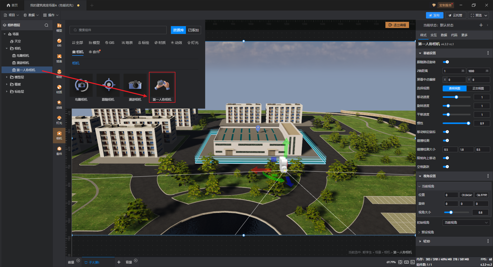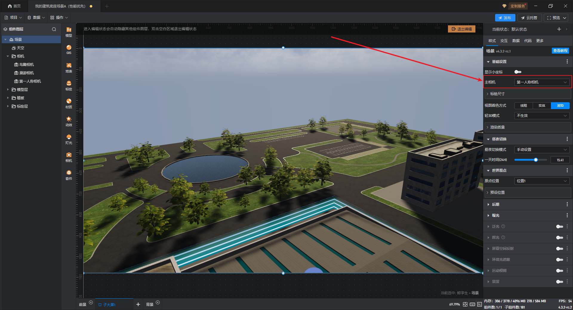 在组件图层中选中“场景”图层,在“样式-基础设置”中将主相机设置为“第一人称相机”,如下图所示: