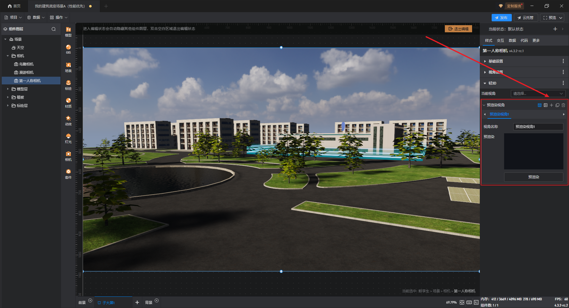 选中“第一人称相机”,在右侧的样式设置中找到并展开“轻 3D”设置一栏,点击“+”添加一个“预渲染视角”,如下图所示: