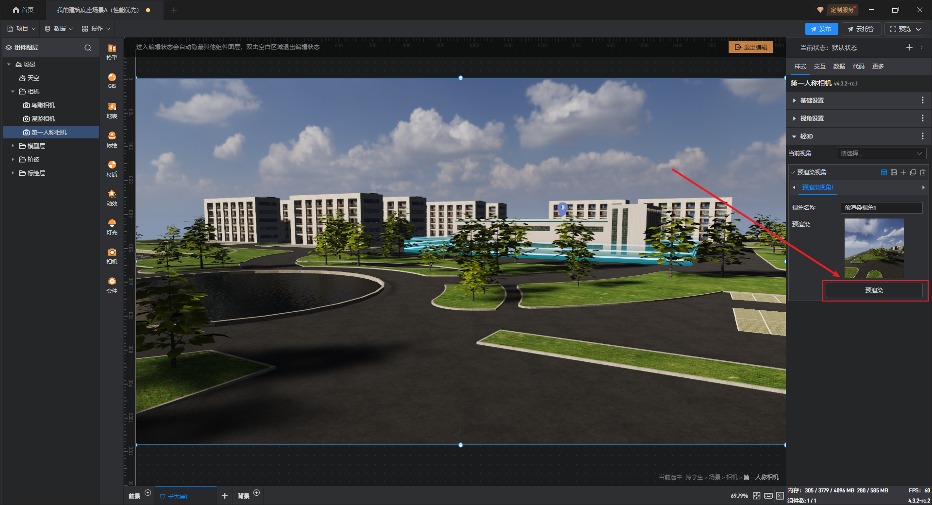 点击下方的“预渲染”按钮对当前视角进行渲染,如下图所示: