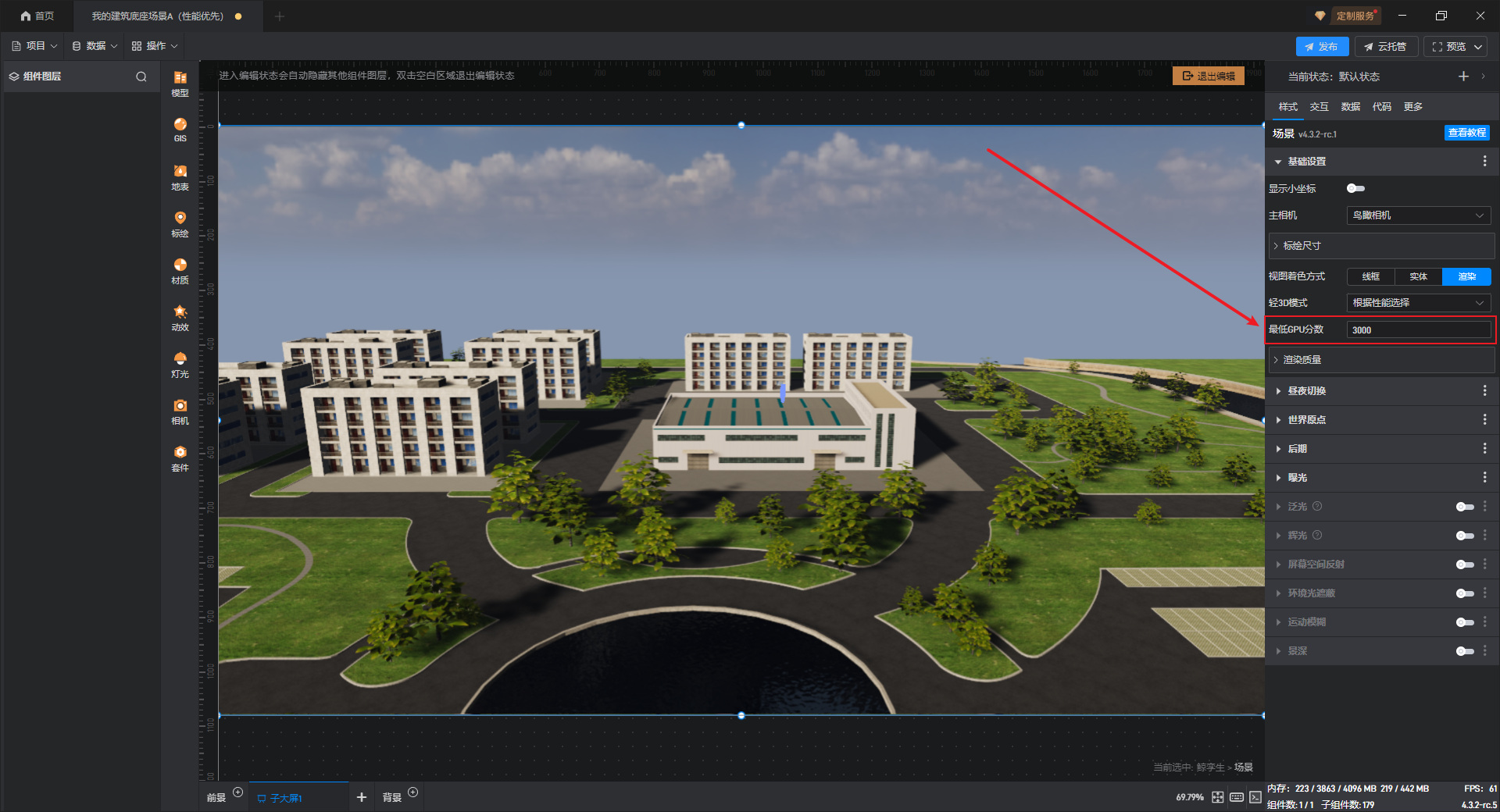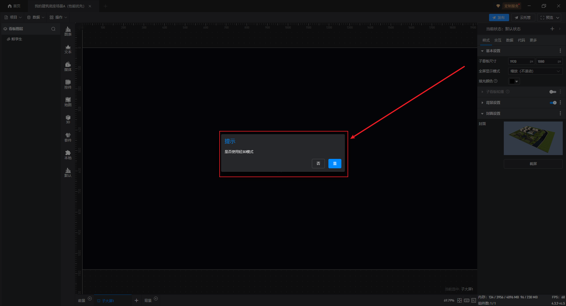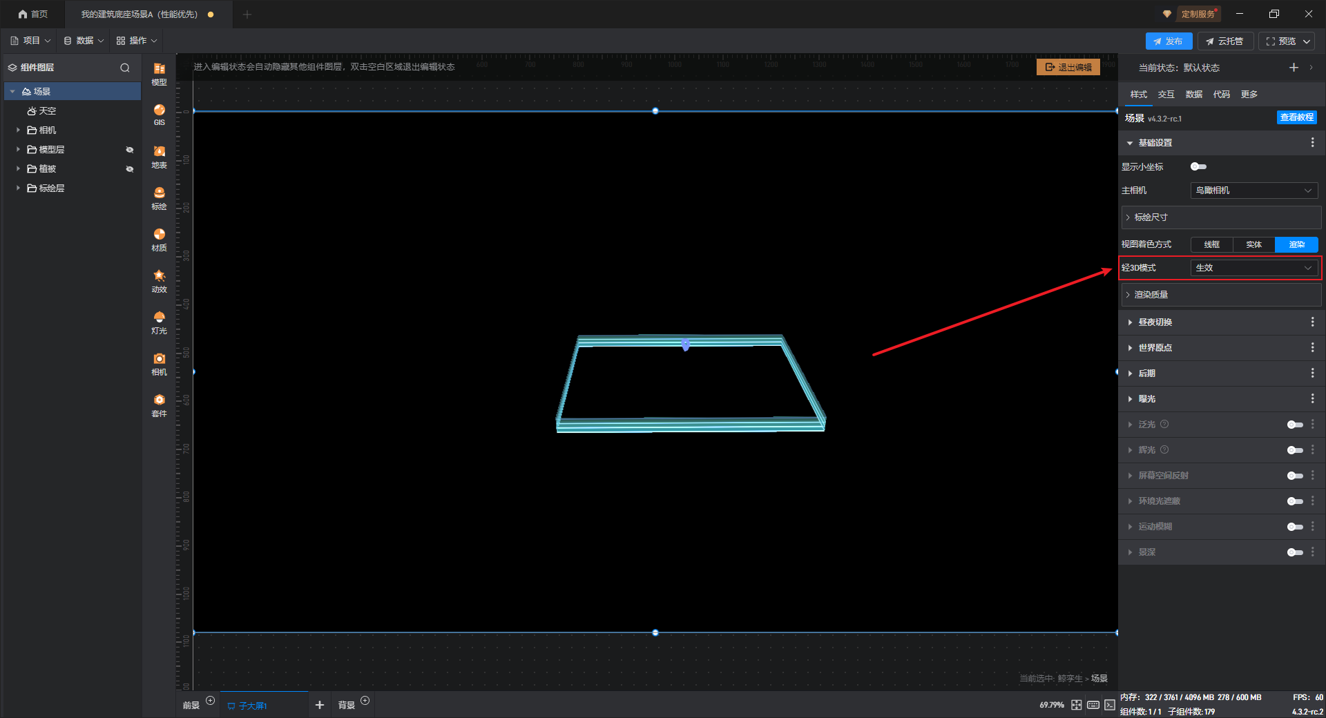 在组件图层中选中“场景”图层,在“样式-基础设置”中将轻 3D 模式设置为“根据性能选择”,如下图所示: