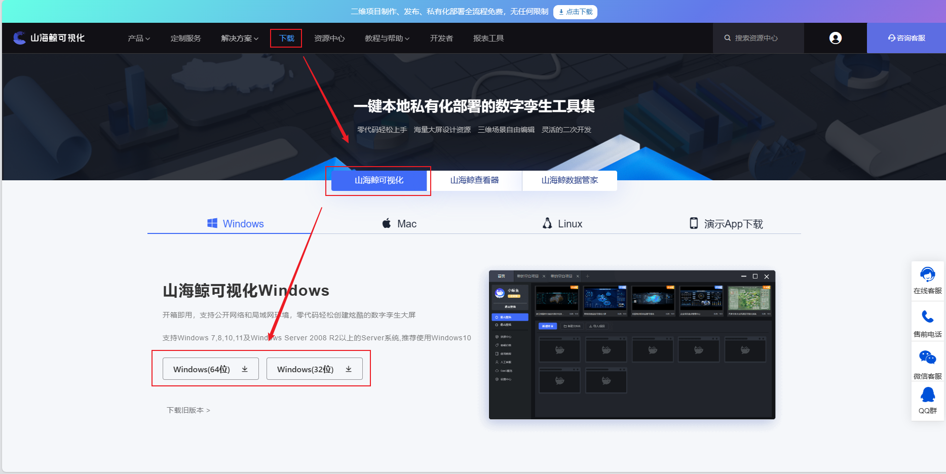 在山海鲸可视化官网中选择适配的版本安装包下载,在本地电脑中安装好软件并启动。