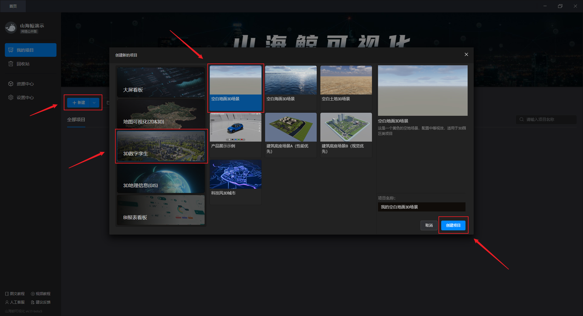 在山海鲸软件首页点击“新建”,在弹出的窗口中选择“3D 数字孪生”,创建一个空白地面 3D 场景。
