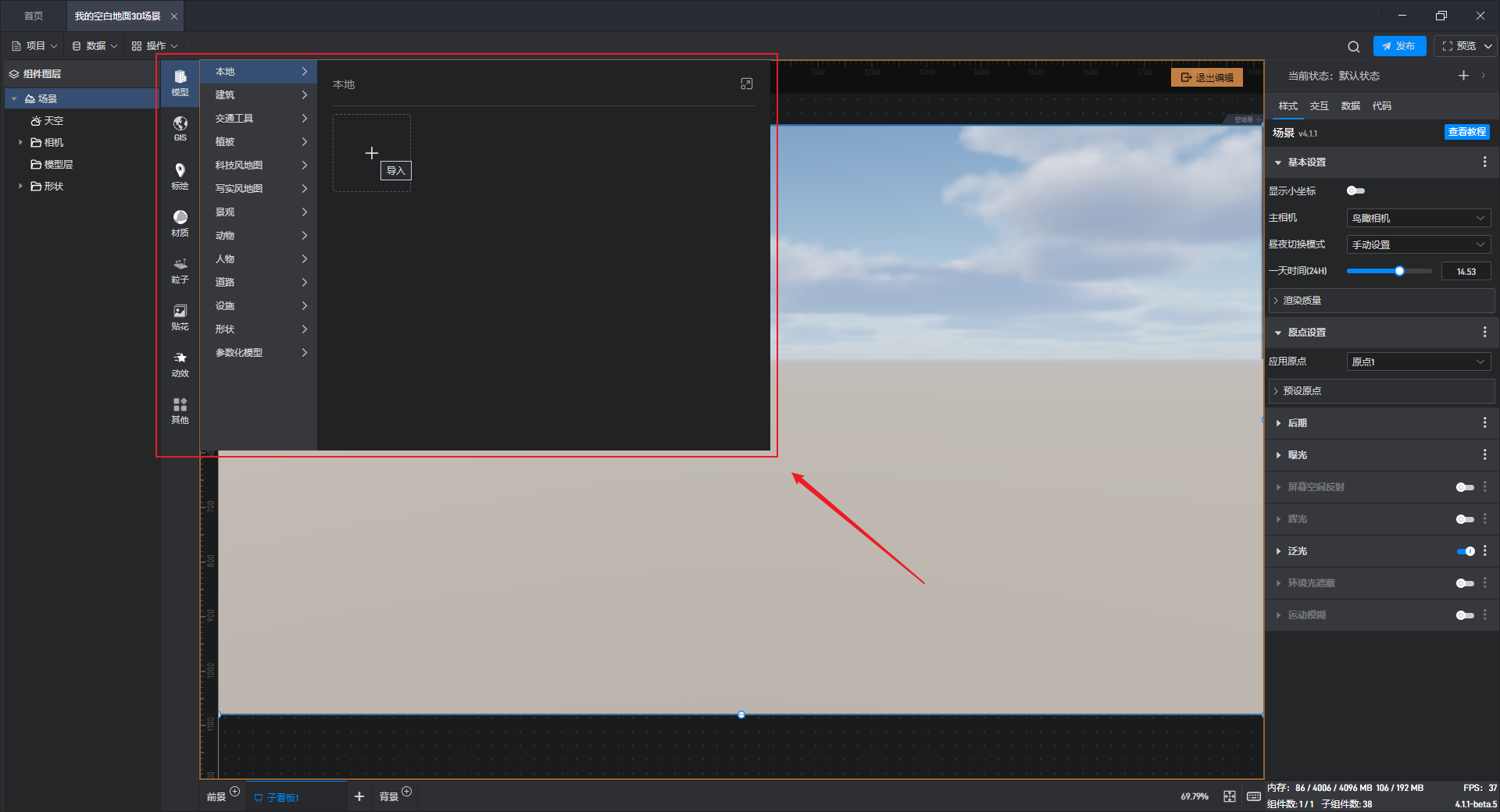 在工具栏中选择“模型”,点击“本地”中的“+”号可以添加一个已经通过 Blender 等建模软件完成建模的模型到 3D 场景中。