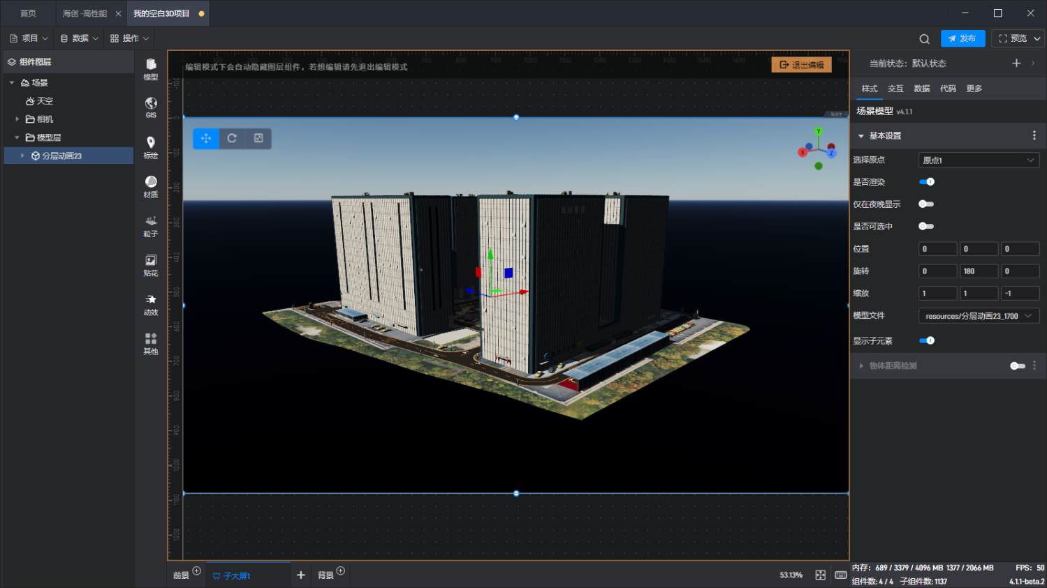 在山海鲸可视化中,分层动画是其中一个很基础的功能点。本教程主要教大家如何在山海鲸可视化中设置楼层分层动画,关于建模与模型美化部分,有兴趣的小伙伴可以到网上或是对应教程进行了解和学习。