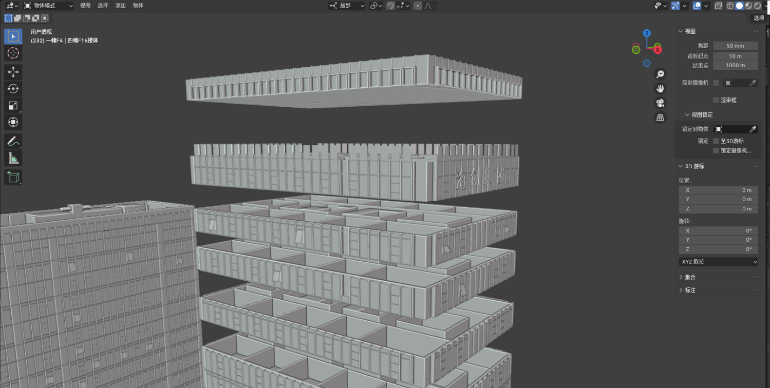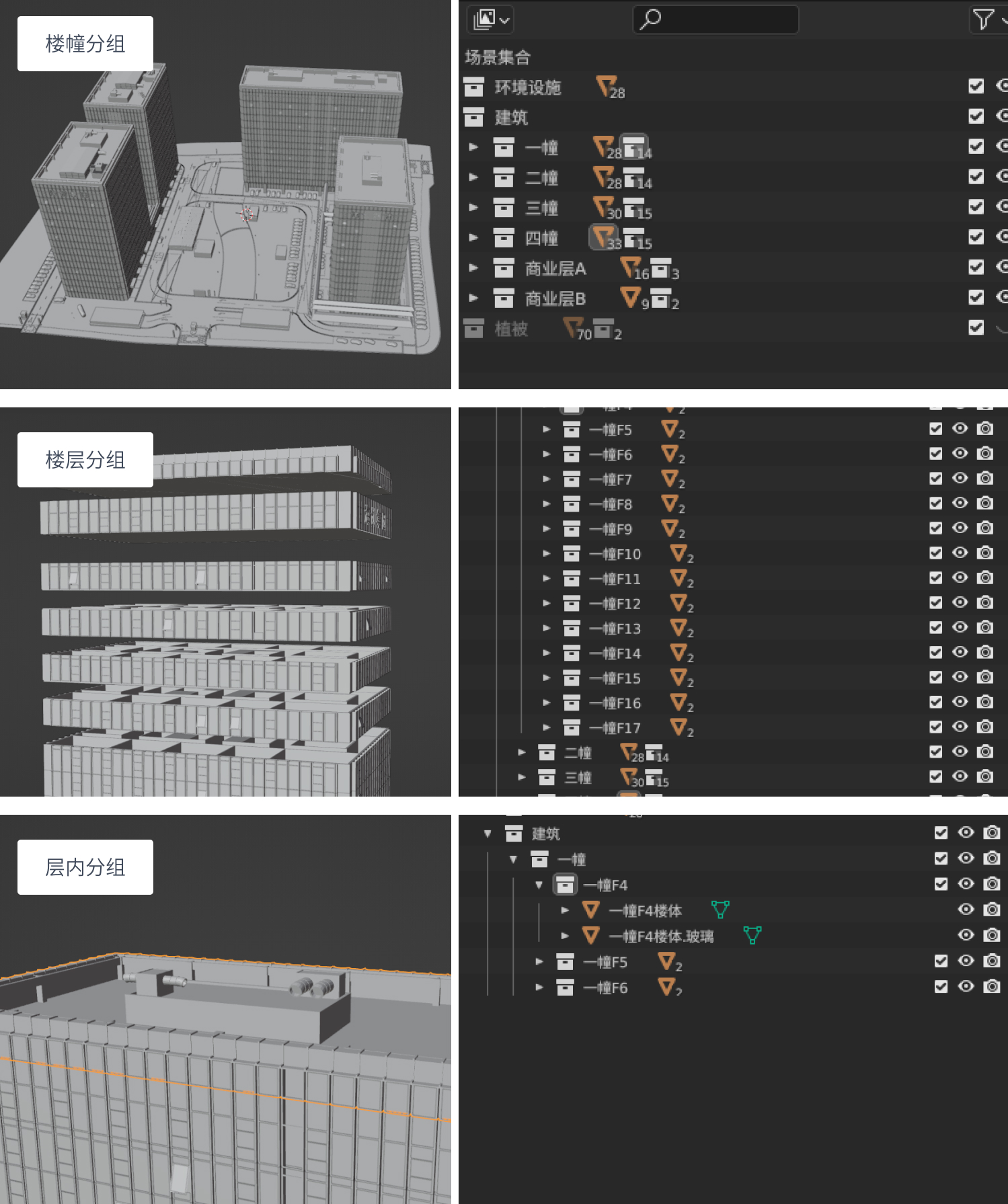 除此之外,还需要按规范整理分组,清晰干净的分组有便于更好地组织和管理相关图层。以 Blender 为例,这里的层级从高到低分别是:楼栋>楼层>楼层物体,(比如:四幢>四幢 F1>四幢 F1 地板),其他与分层动画无关的以物体名称命名即可。