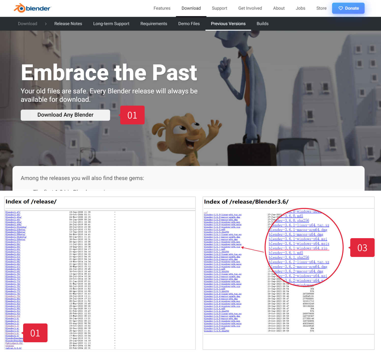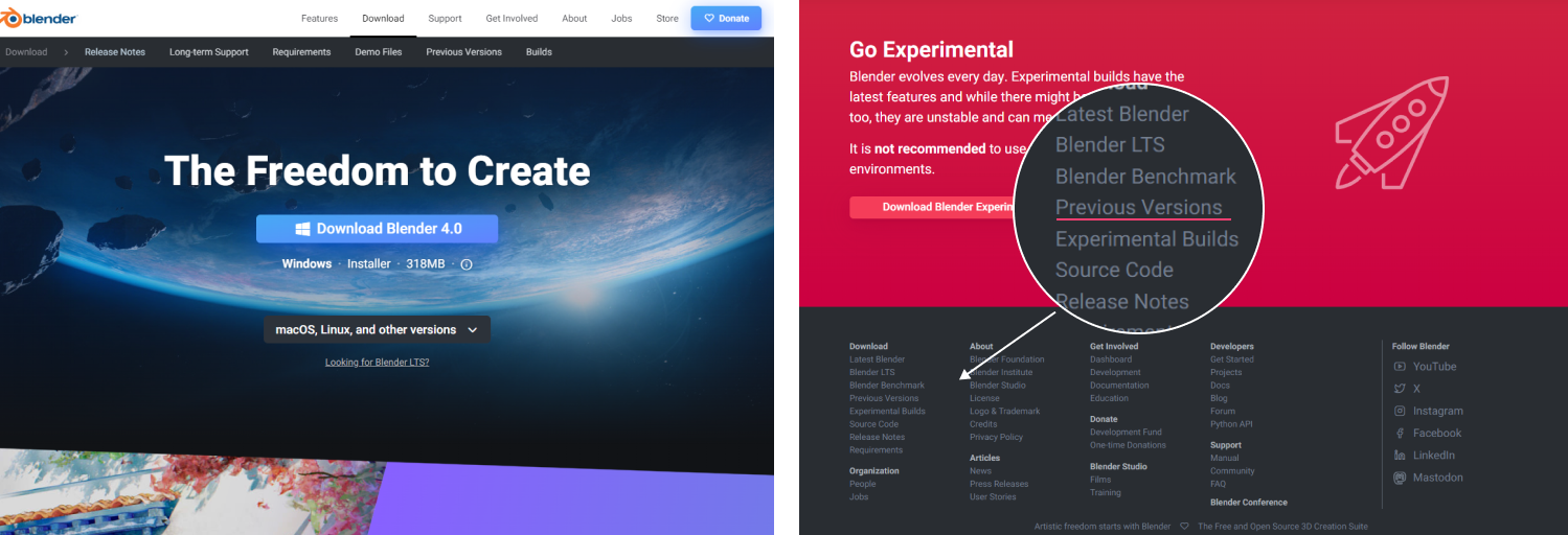 blender 官网链接https://www.blender.org/download/,为了更好的兼容,请安装 blender3.6 版本,在首页最底部找到 Previous Versions。
