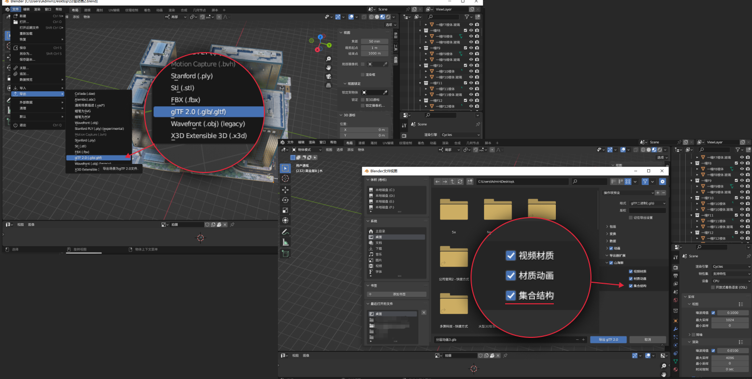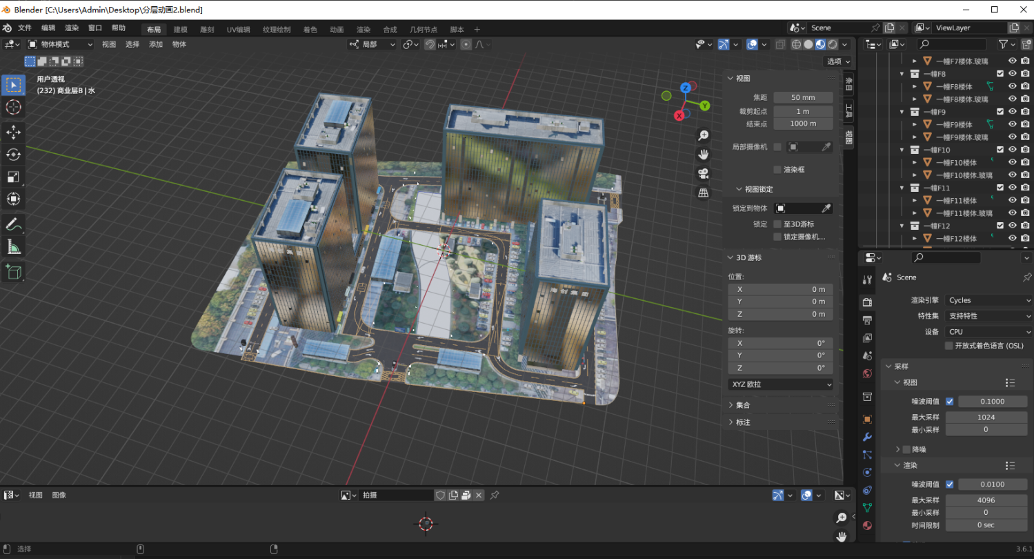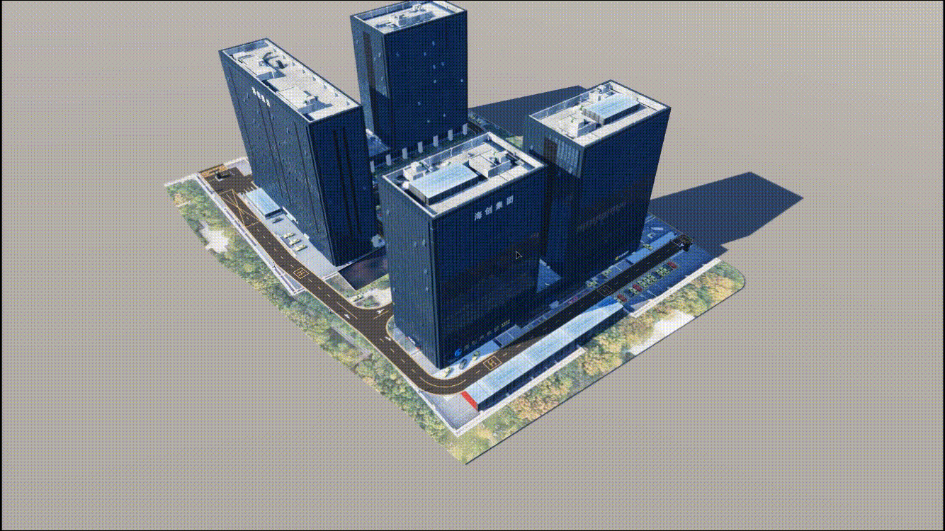 以园区模型为例,这是我们提前用 blender 搭建好的模型,这里也可以通过其他软件建模然后导入 blender,不过材质信息可能会丢失。