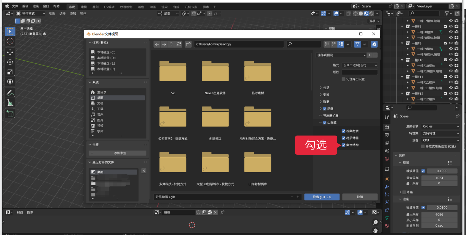 导出格式为 glb,同时勾选集合结构(安装了山海鲸插件才会出现该选项)。