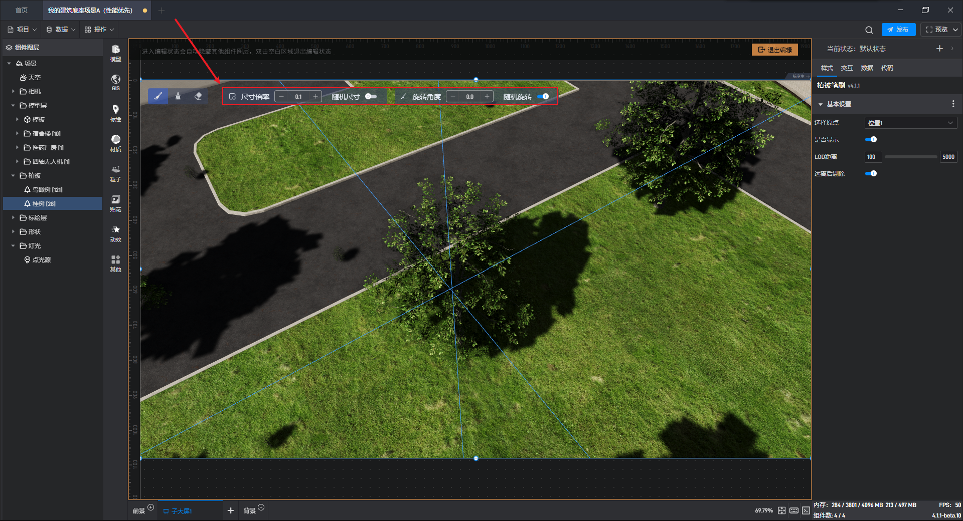 可在右侧调整植被尺寸、植被旋转角度等参数。