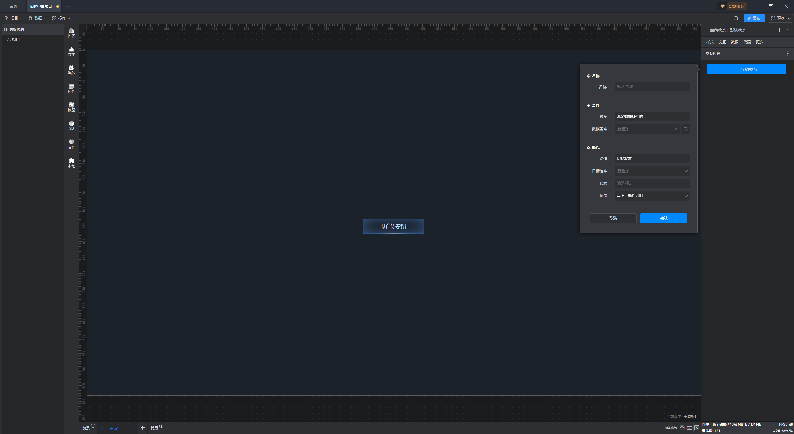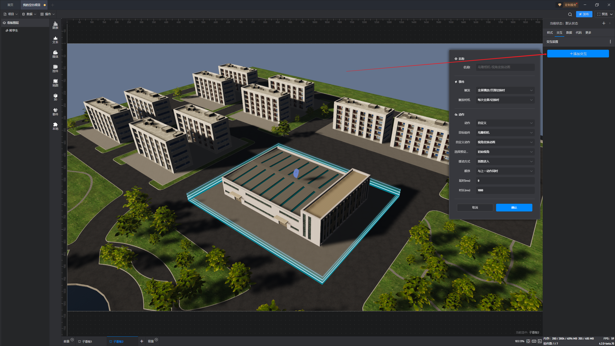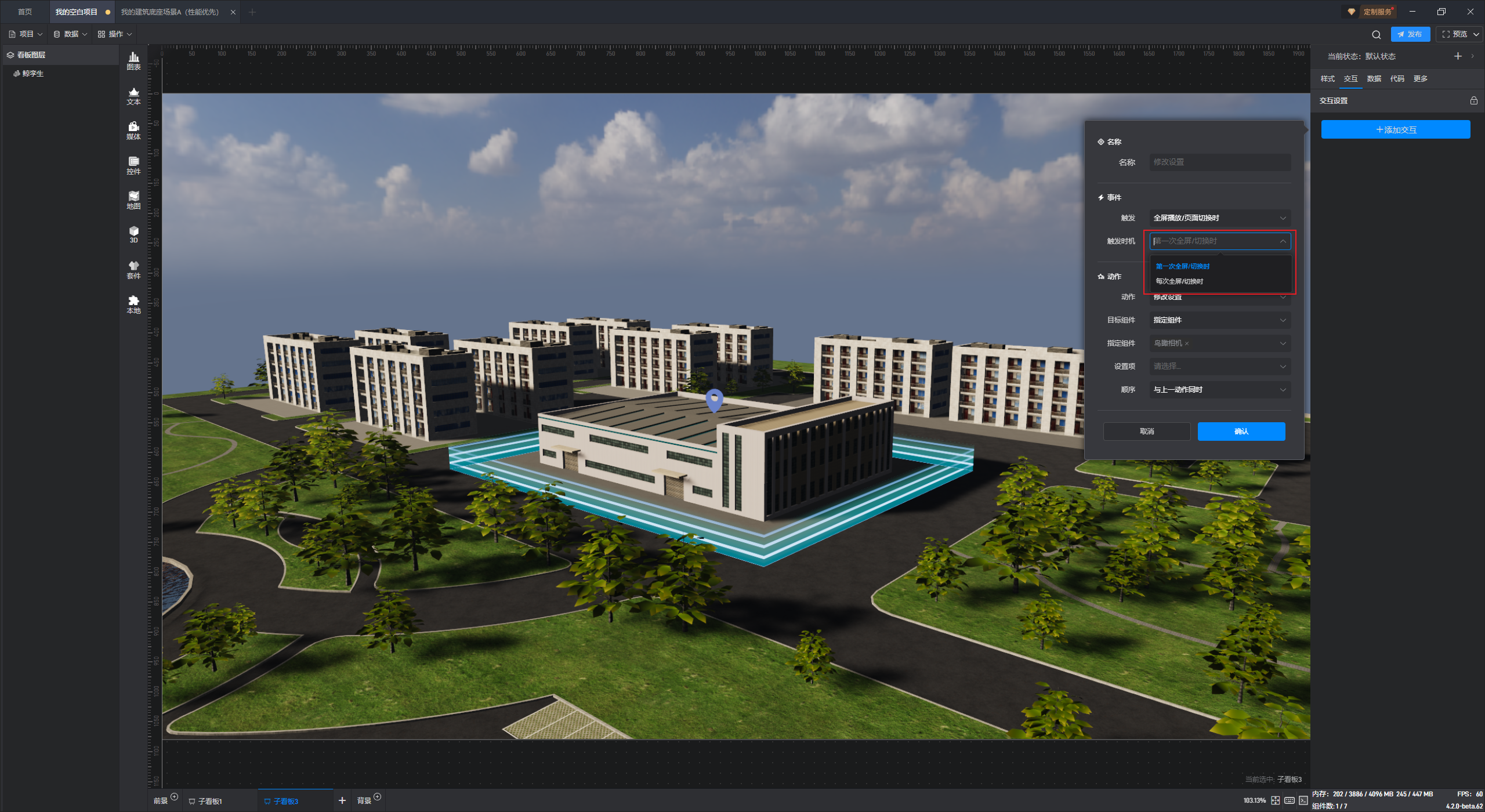 通过全屏播放或页面切换来触发的交互通常是用于恢复项目或子看板的初始状态(切换组件的状态,关于多状态切换请看这里:设置组件的多状态),尤其是鲸孪生里三维场景的初始状态,因为我们在三维场景中可以对模型进行各种操作,如果希望打开项目时,或者页面切换时,三维场景恢复到对应的初始状态,此时我们就可以通过这个交互进行设置。