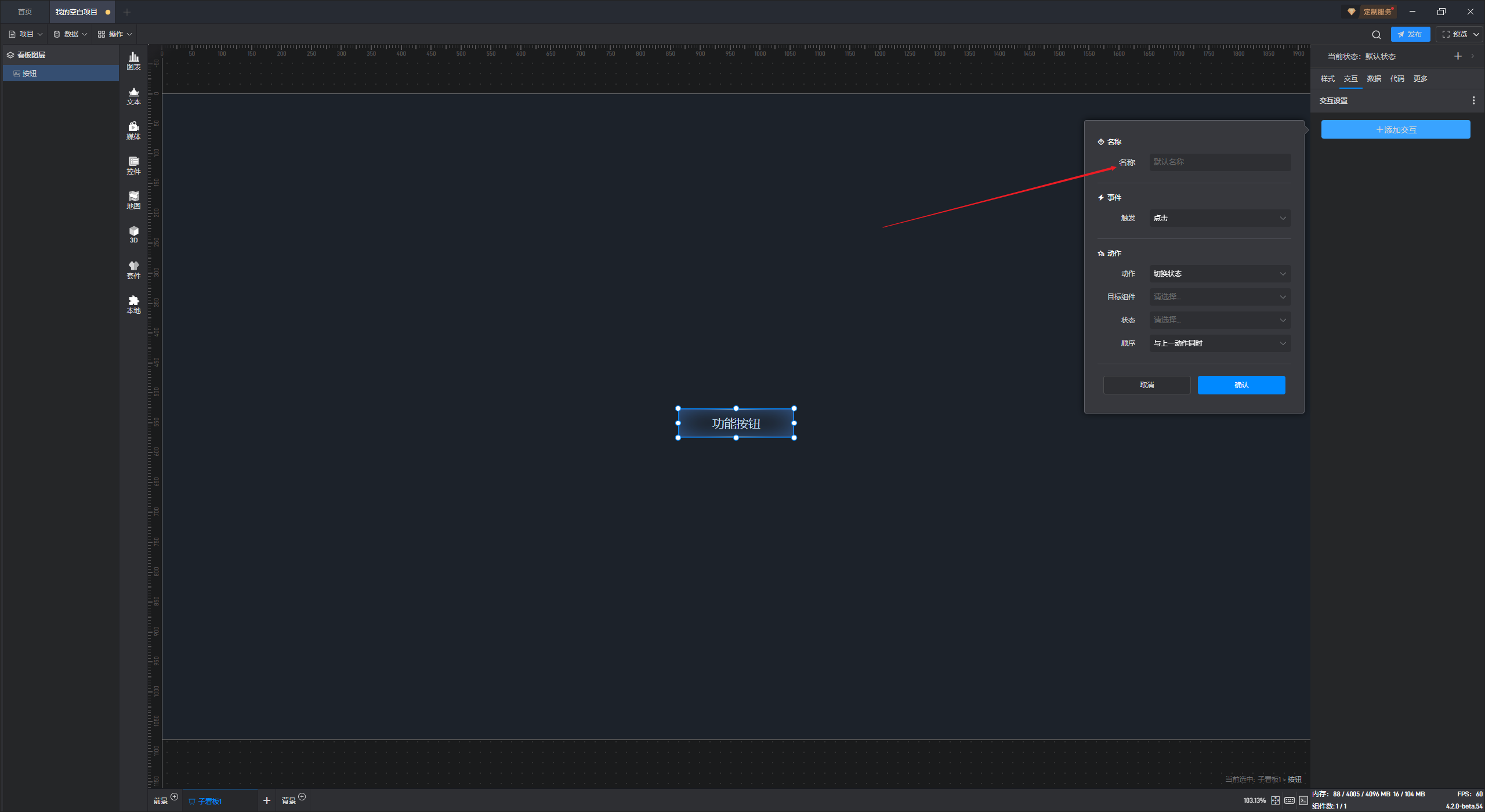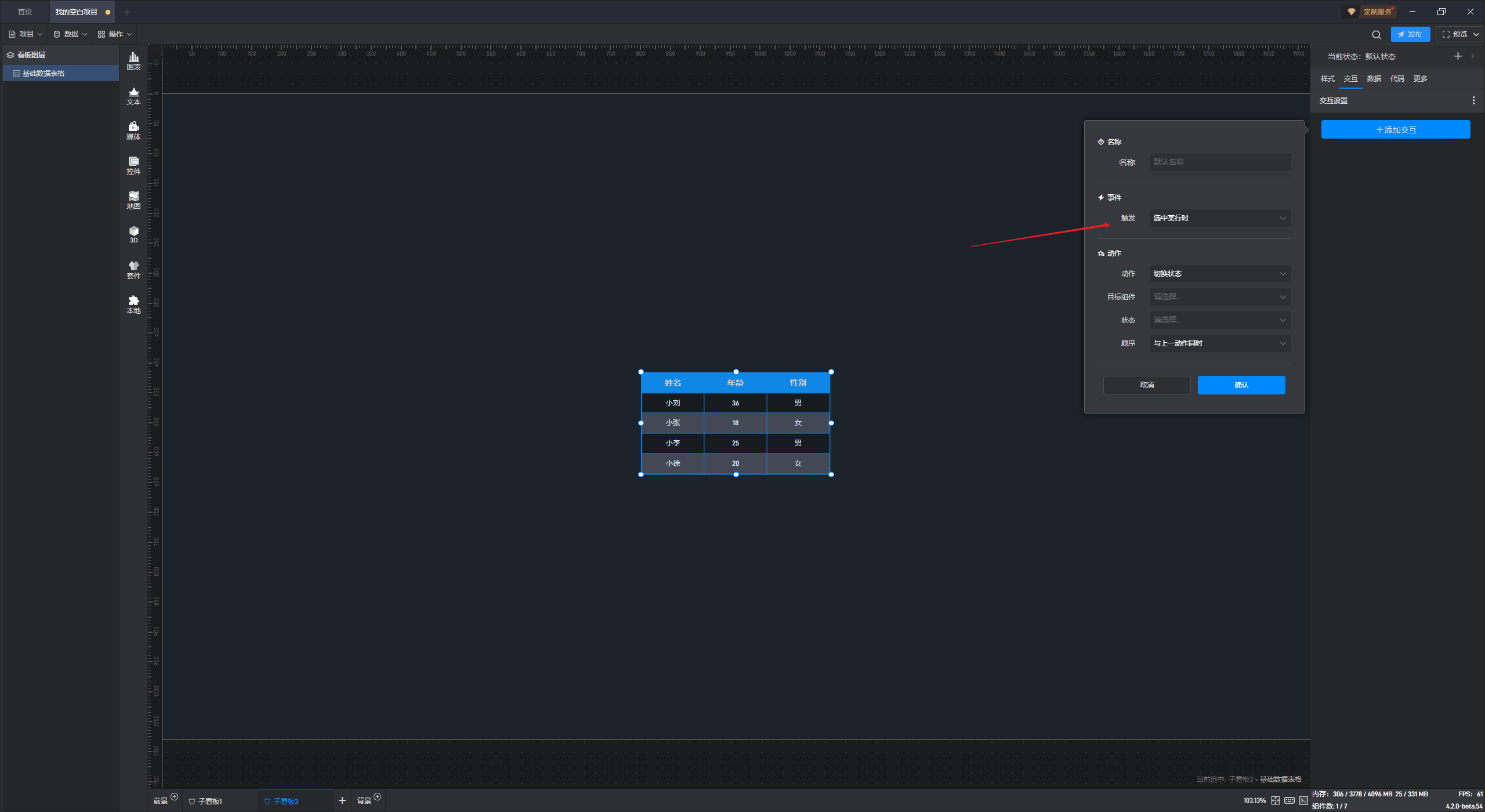在子看板上和在组件上都可以设置交互,交互包含三个元素:名称、事件和动作。