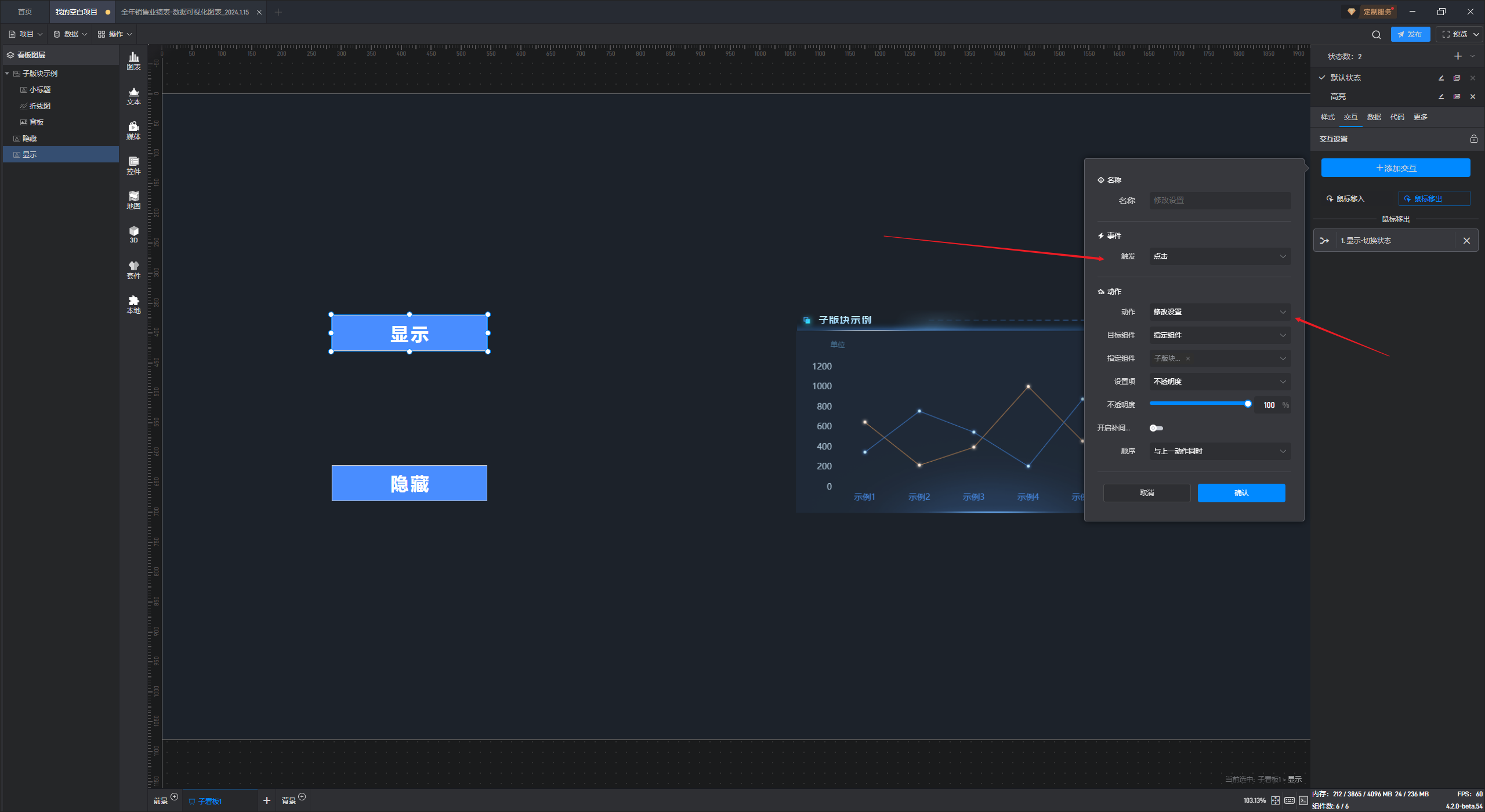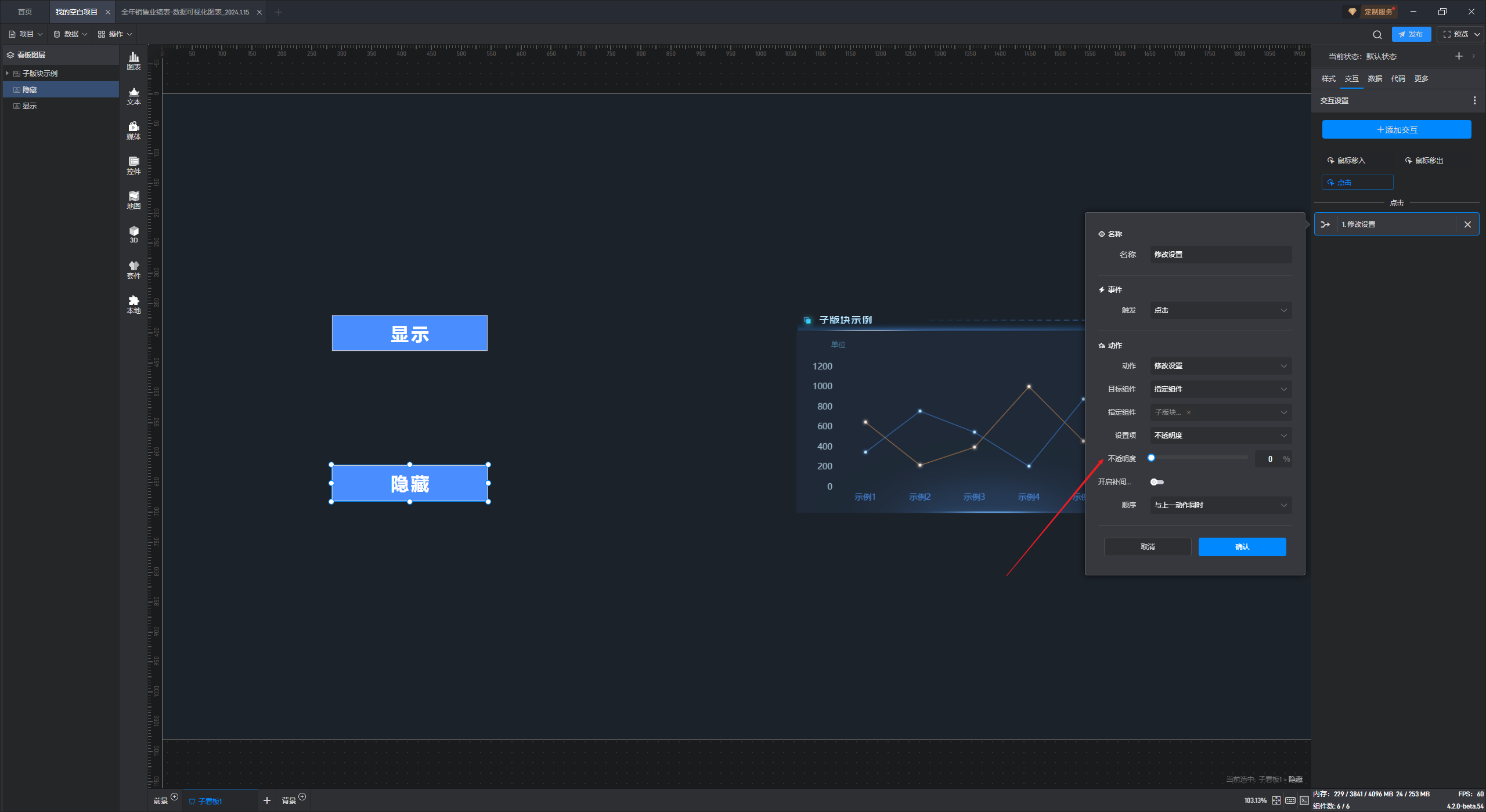 接下来我们再添加一个点击的交互,这里我们可以通过点击来修改目标组件的参数,将透明度修改为 100%(透明度参数对应的就是组件的显示,100%完全显示,0%隐藏)。