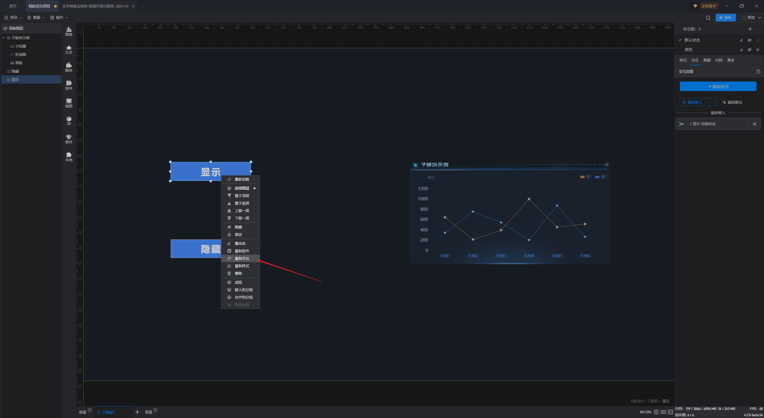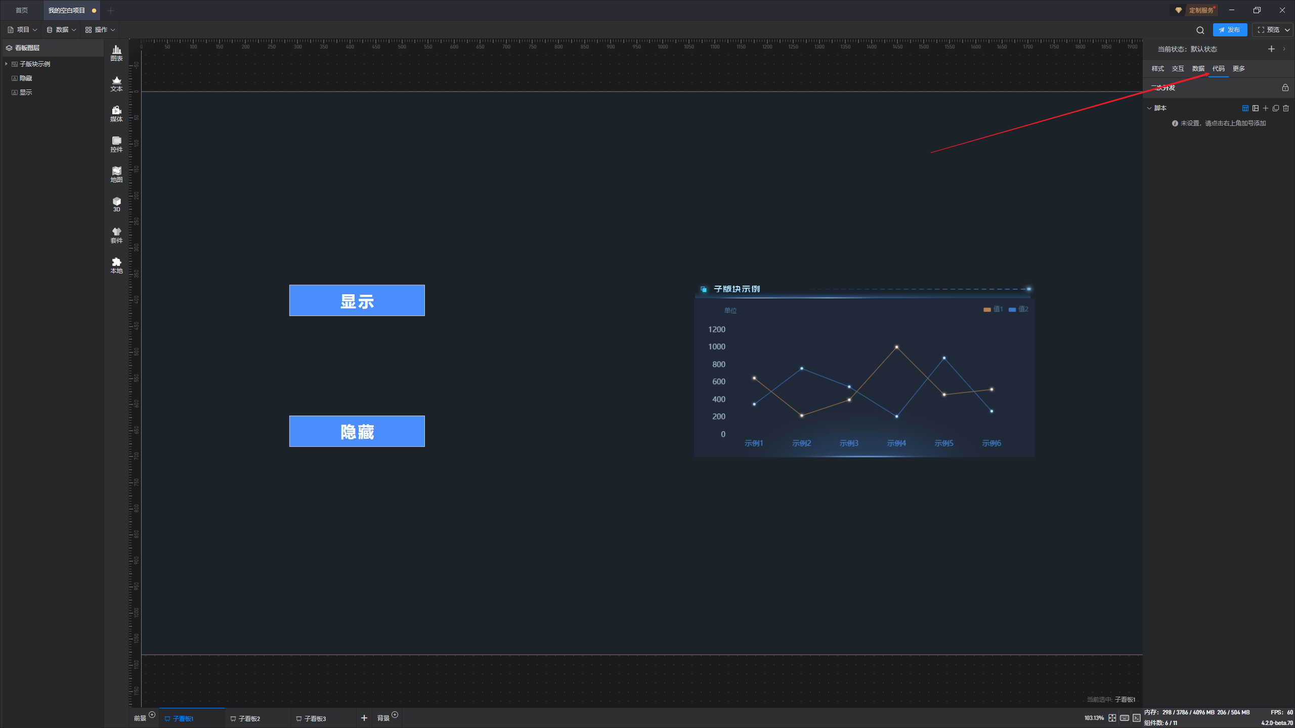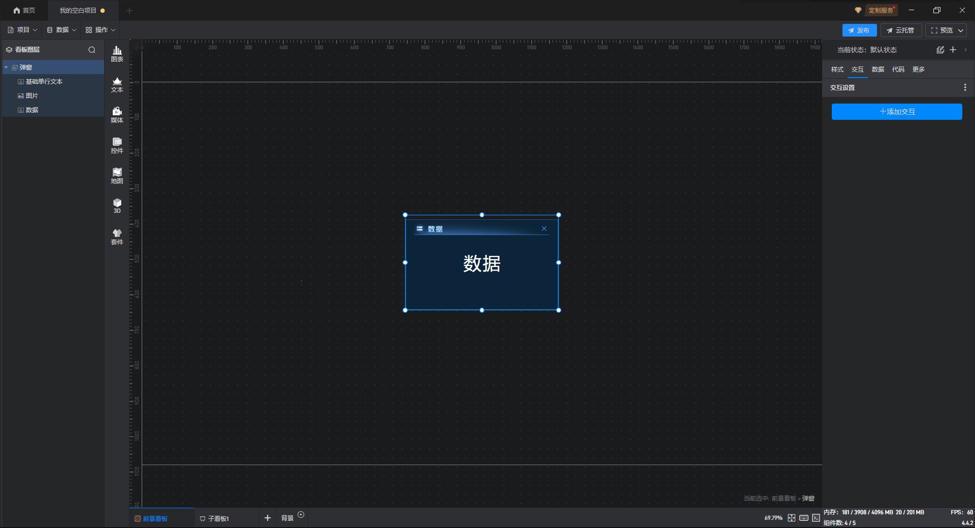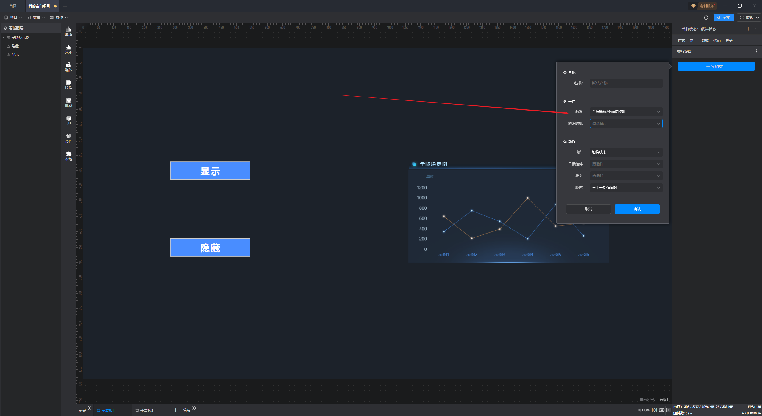 点击页面空白区域就可以选择当前子看板,此时右侧的设置都是子看板的设置,点击添加交互即可给当前子看板添加交互。
