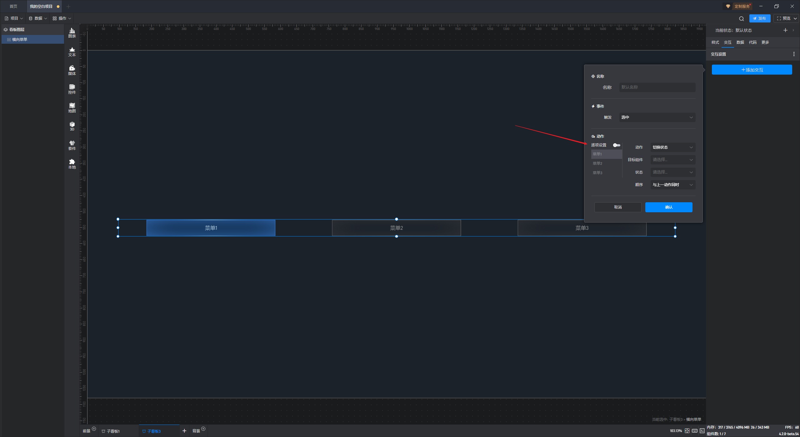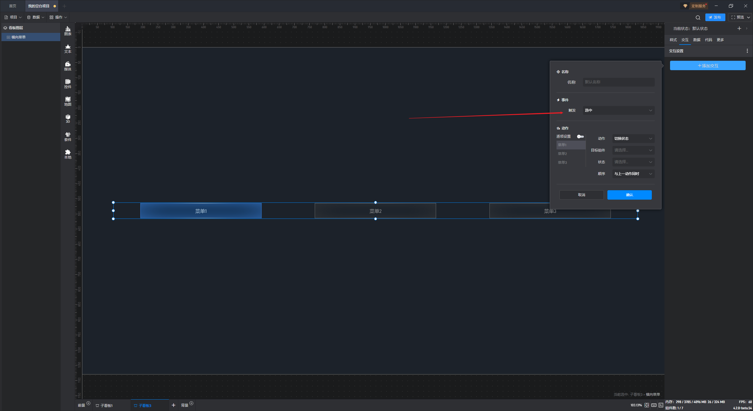 部分组件在设置选中交互时,还可以设置选中的具体对象,例如菜单里的某一个选项,分层动画里的某一层。