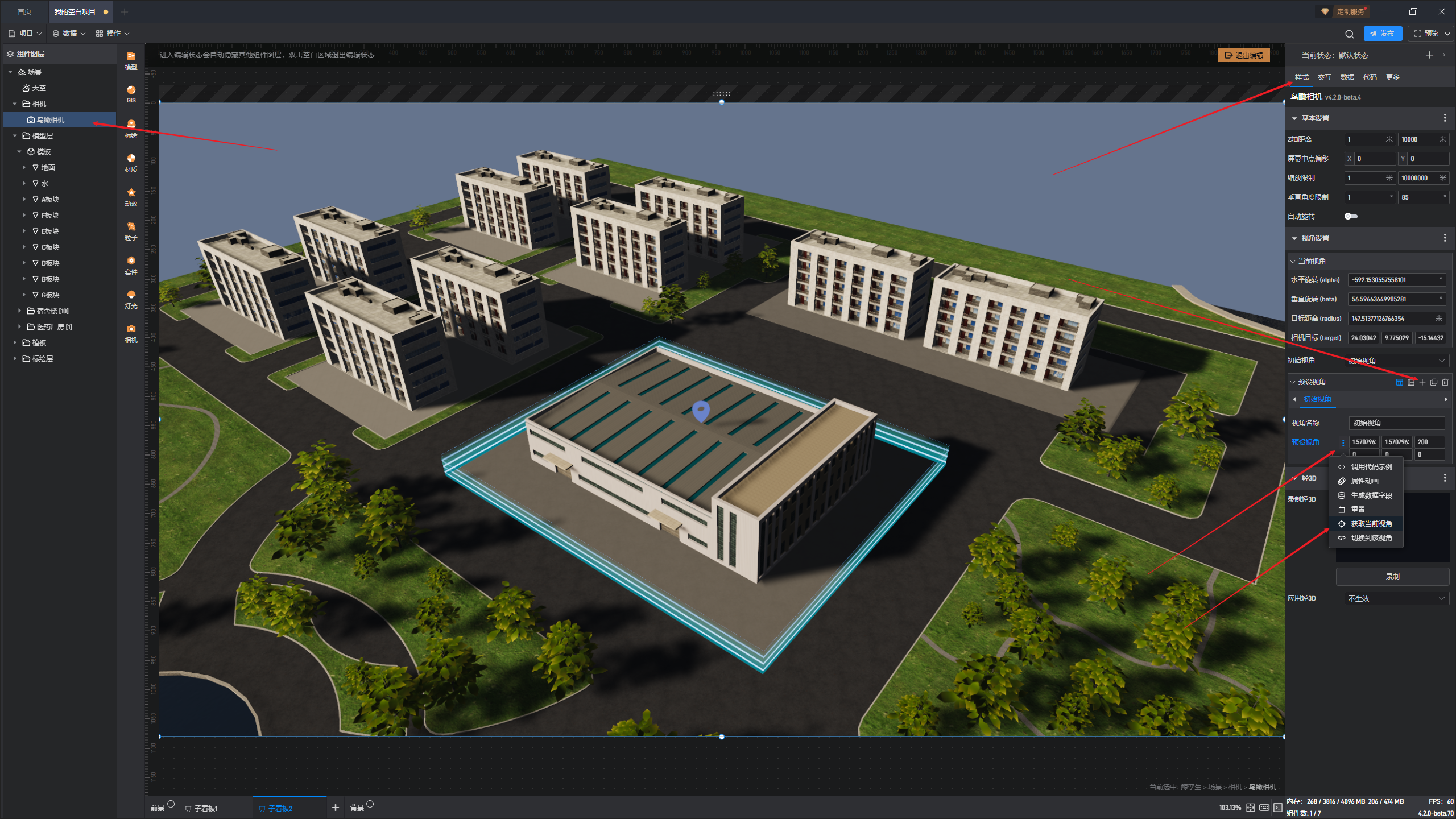 双击鲸孪生组件进入编辑模式,在左侧选择“鸟瞰相机”,然后在右侧样式设置中,点击加号添加一个预设视角,改名为:默认视角。