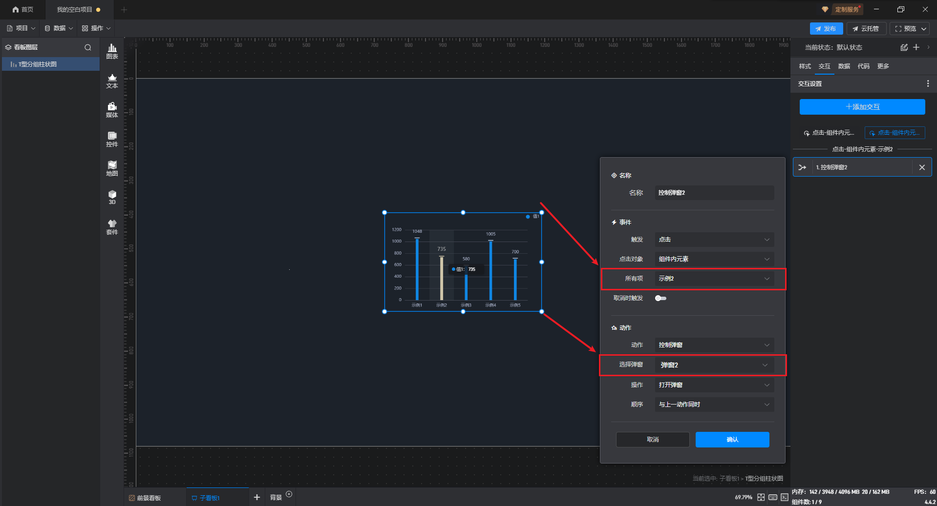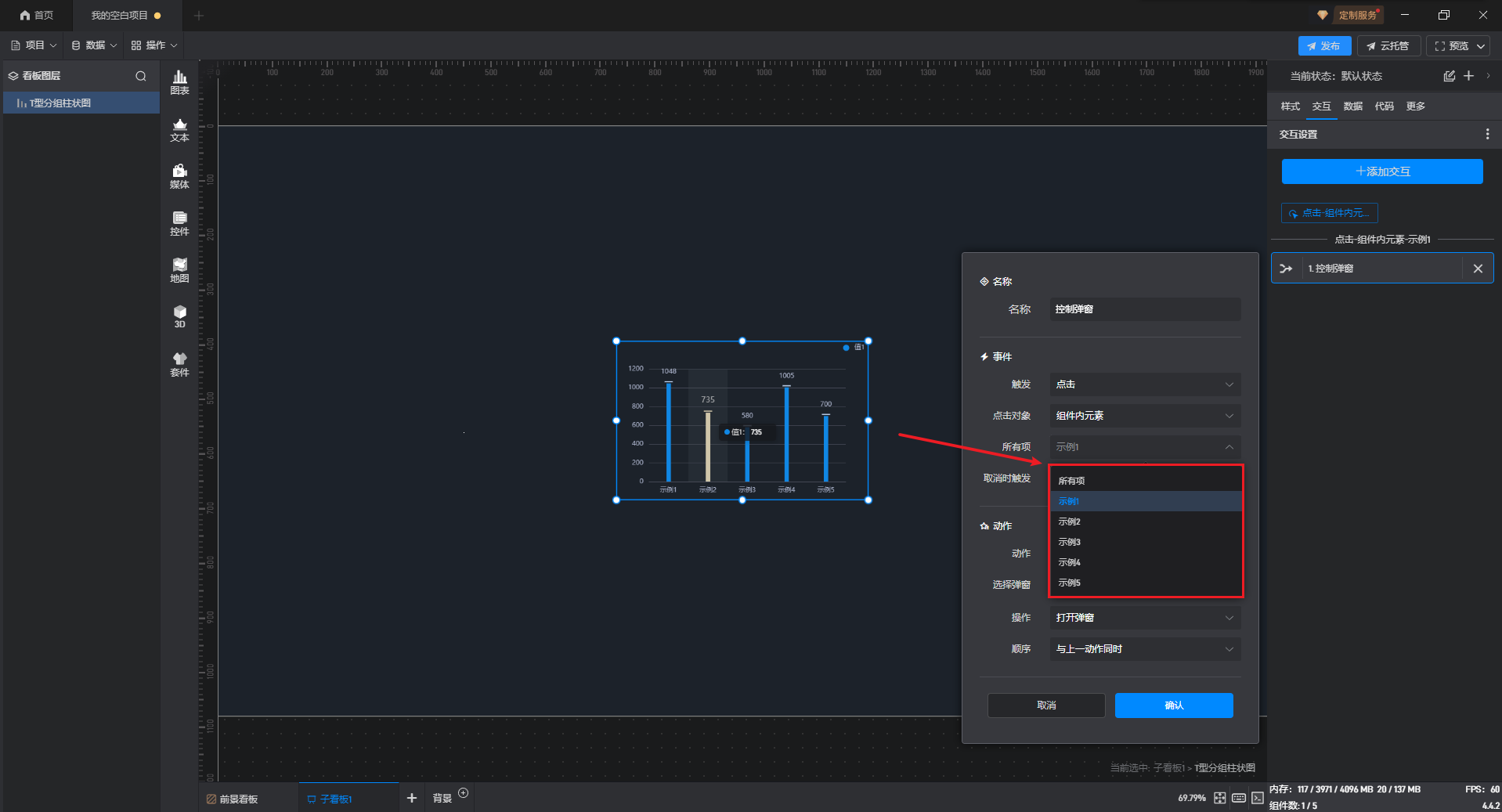 以 T 型分组柱状图组件为例,我们可以为“示例 1”和“示例 2”两个数据项分别设置一个点击弹出弹窗的交互。