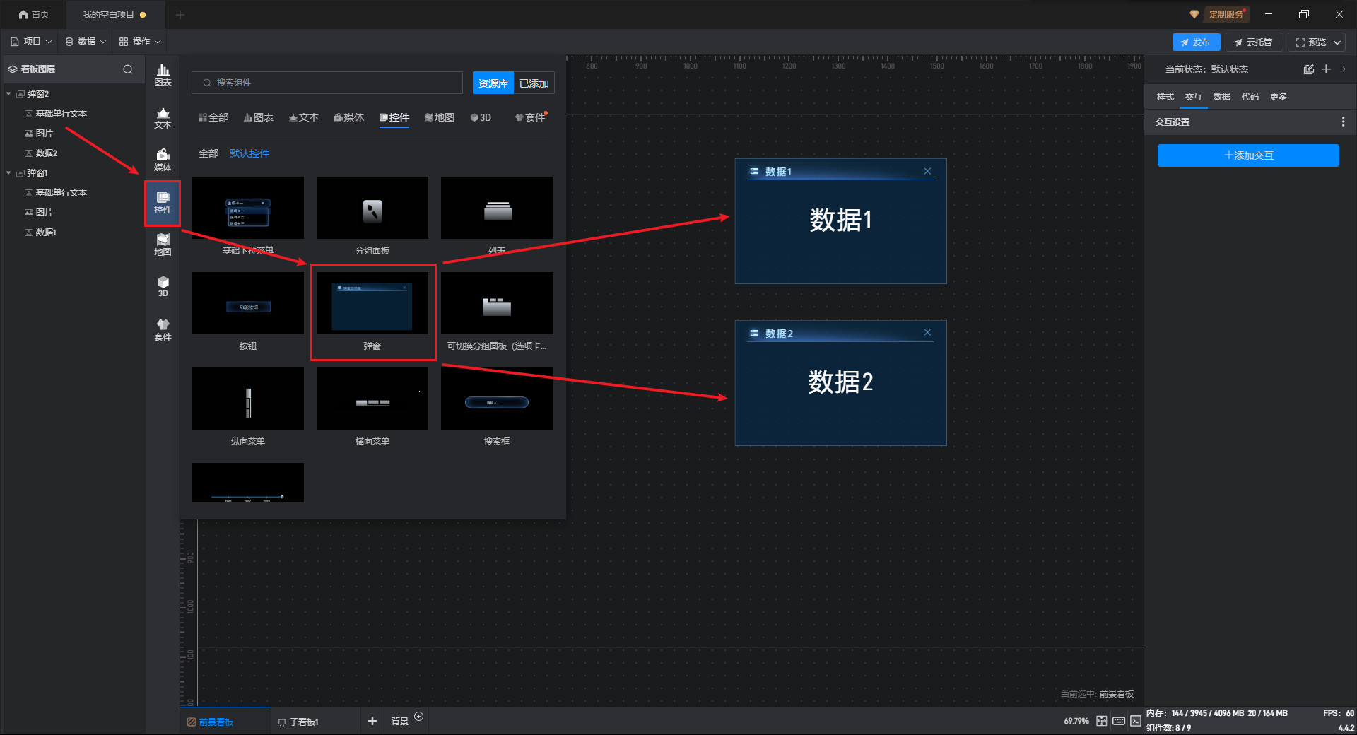 首先,在前景看板中添加两个“弹窗”组件,分别设置对应内容并重命名为“弹窗 1”和“弹窗 2”。
