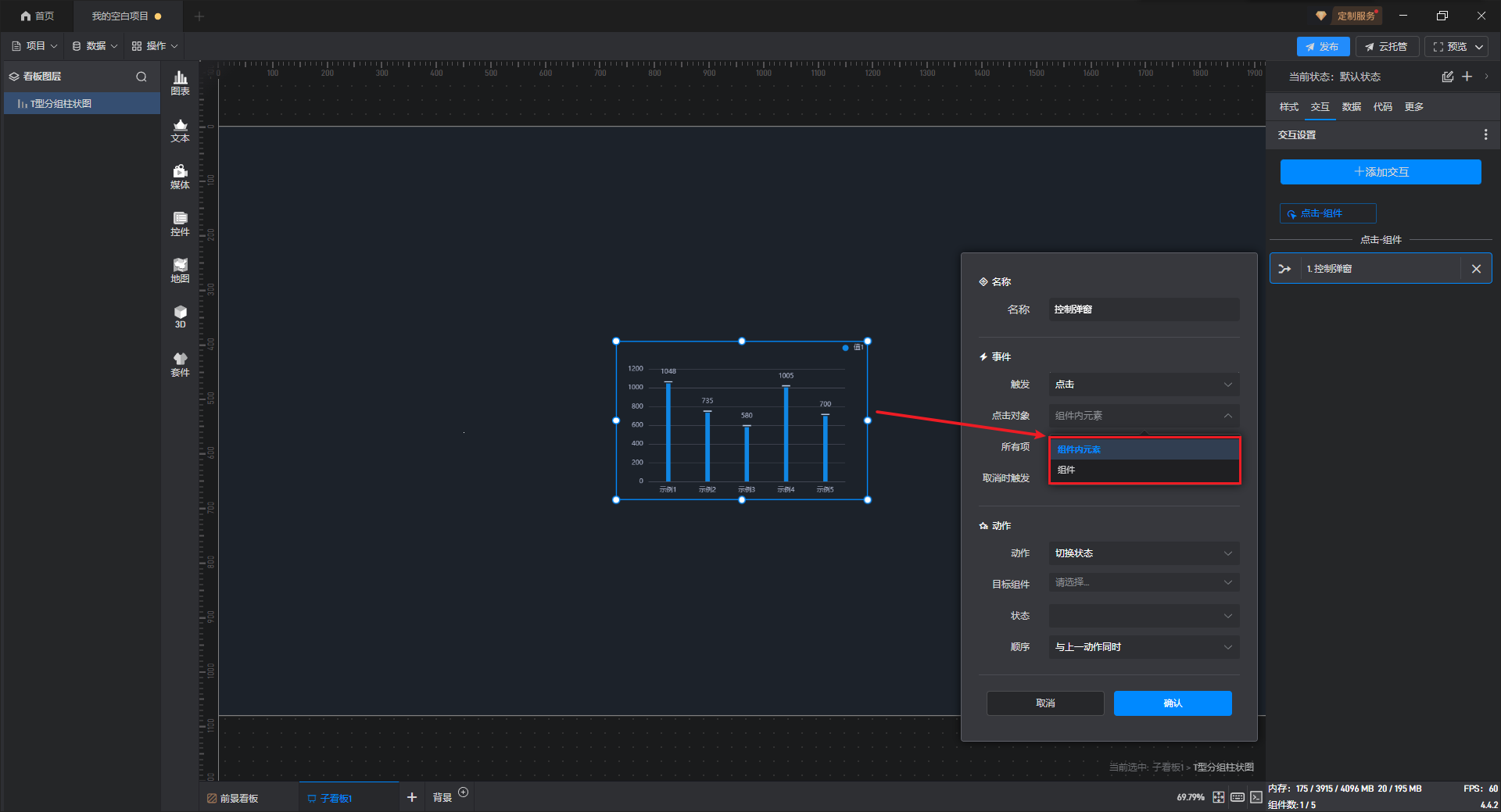 点击组件触发的交互相对比较简单,同样以 T 型分组柱状图为例,当点击对象选择“组件”时,只要在该组件范围内点击就会触发该交互。