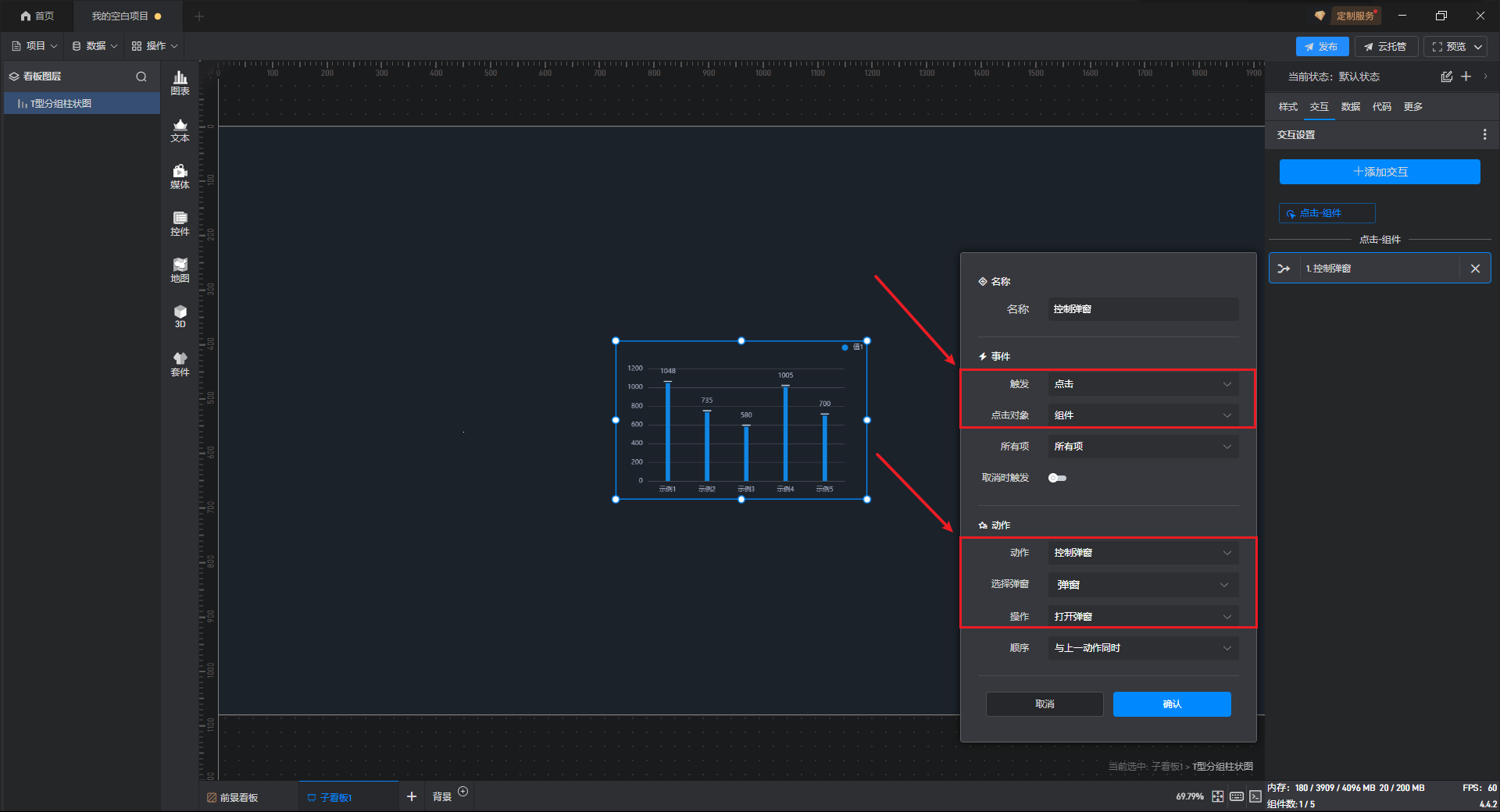 回到子看板 1,为 T 型分组柱状图设置交互,触发事件选择“点击”,点击对象选择“组件”,动作选择“控制弹窗”,选择弹窗中的“弹窗”。设置完成后点击“确认”。