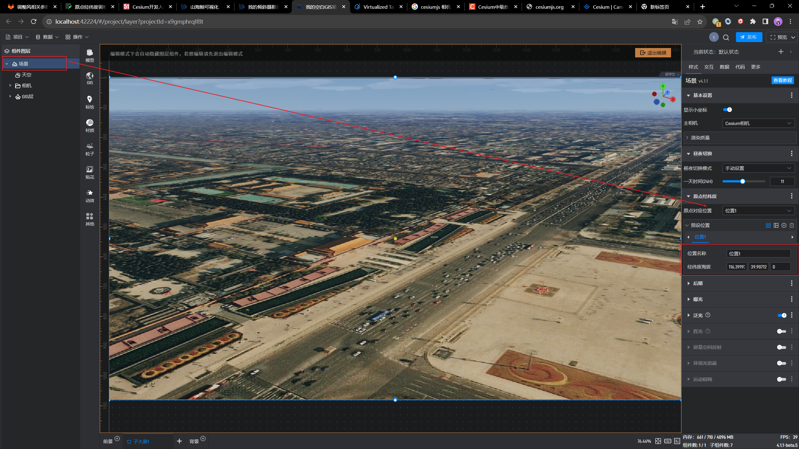 双击进入鲸孪生的编辑模式,选择场景组件,修改当前原点的经纬度信息为(116.391935, 39.907123, 0),如下图所示: