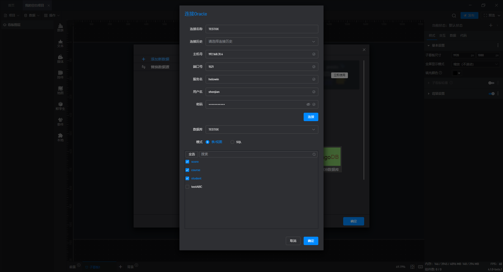 点击“连接”按钮后,在“表/视图”模式下选择需要添加的表所在的数据库名称,软件会在库列表右侧的框中列出该库中所有的表名。勾选需要添加的表,并点击“确定”。