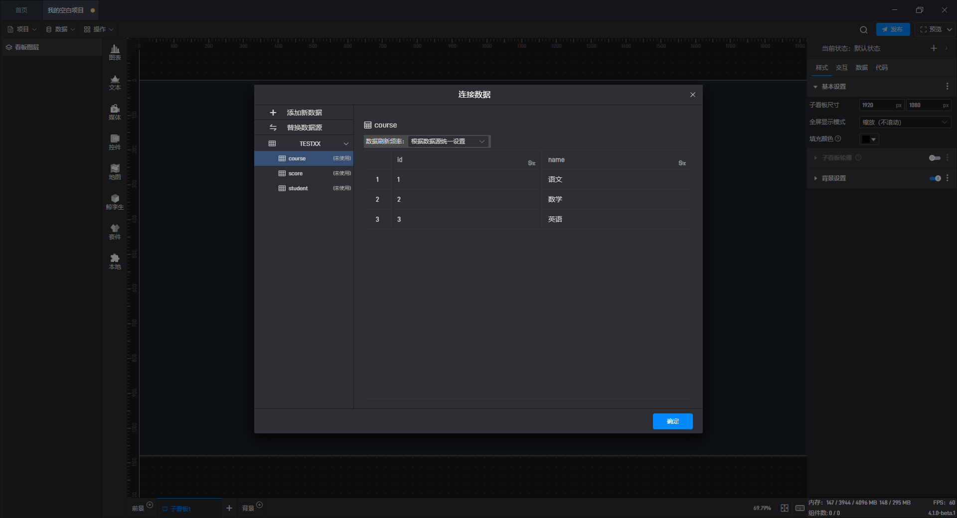 点击“连接”按钮后,在“SQL”模式下点击“+添加 SQL 语句”,输入 SQL 语句“select “name”, “age” from BI.”student””,然后点击“确定”,就可以进行数据筛选的操作。