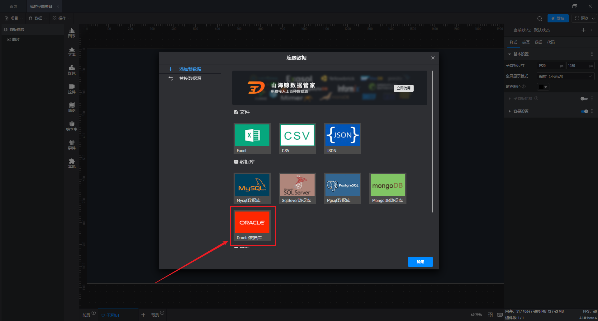 在数据源编辑窗口中,在左侧选择“添加新数据”选项卡,然后在右侧点击数据库分类中的“Oracle 数据库”选项框。