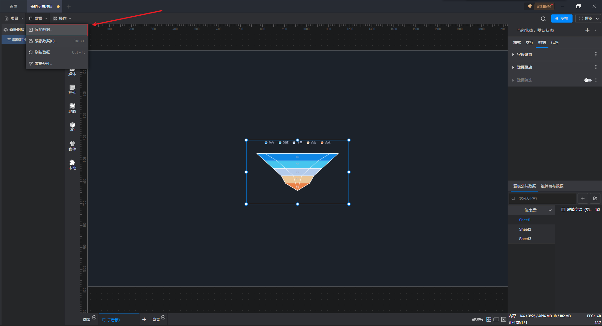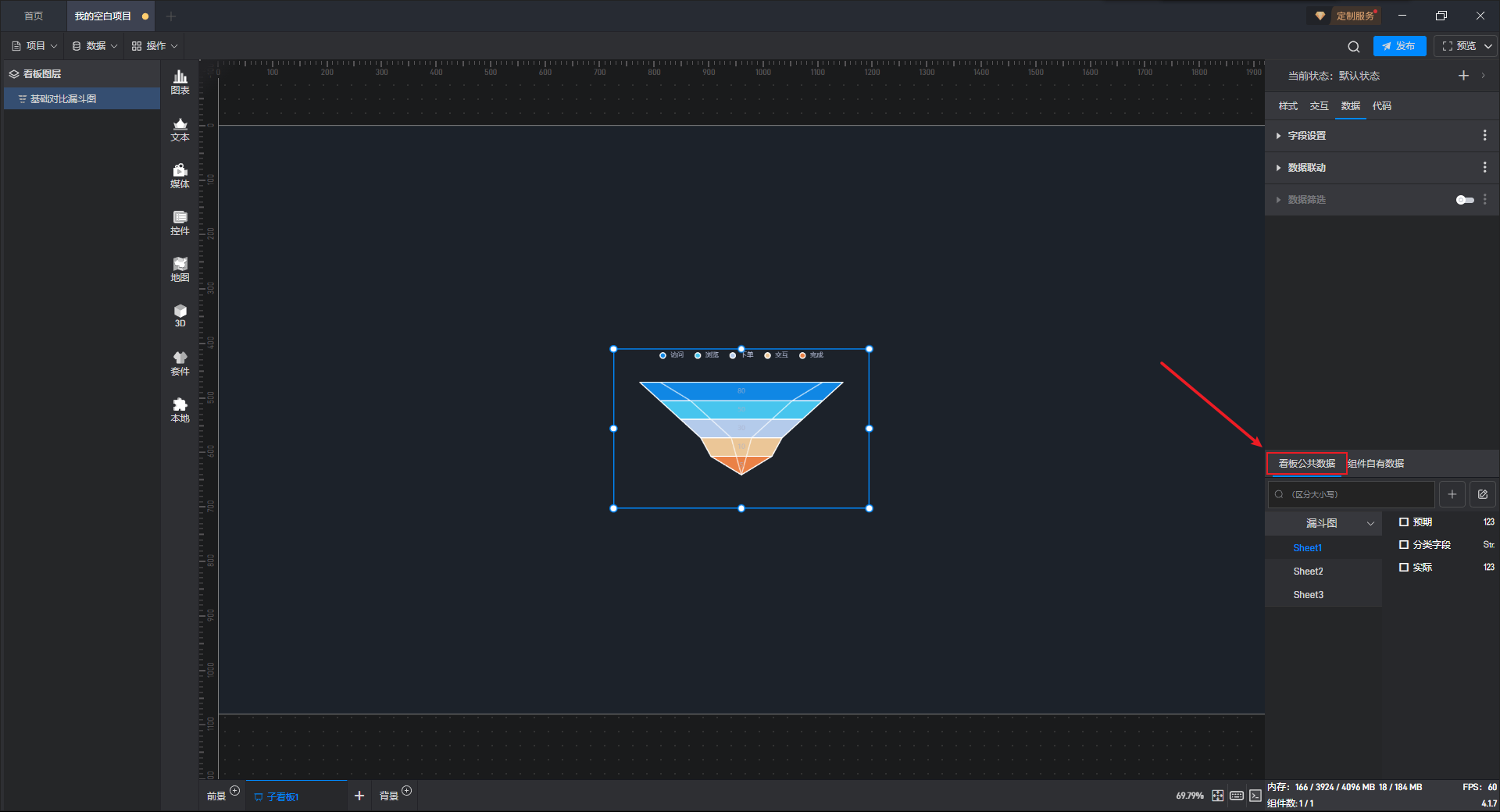 点击选中组件,在右侧“数据”设置窗口中切换到“看板公共数据”(同一个项目中所有数据源是共享的)。