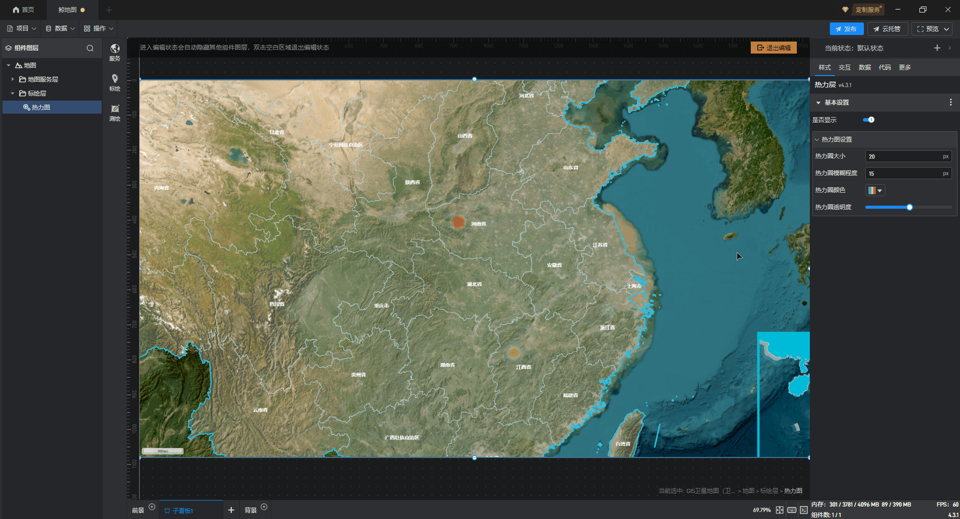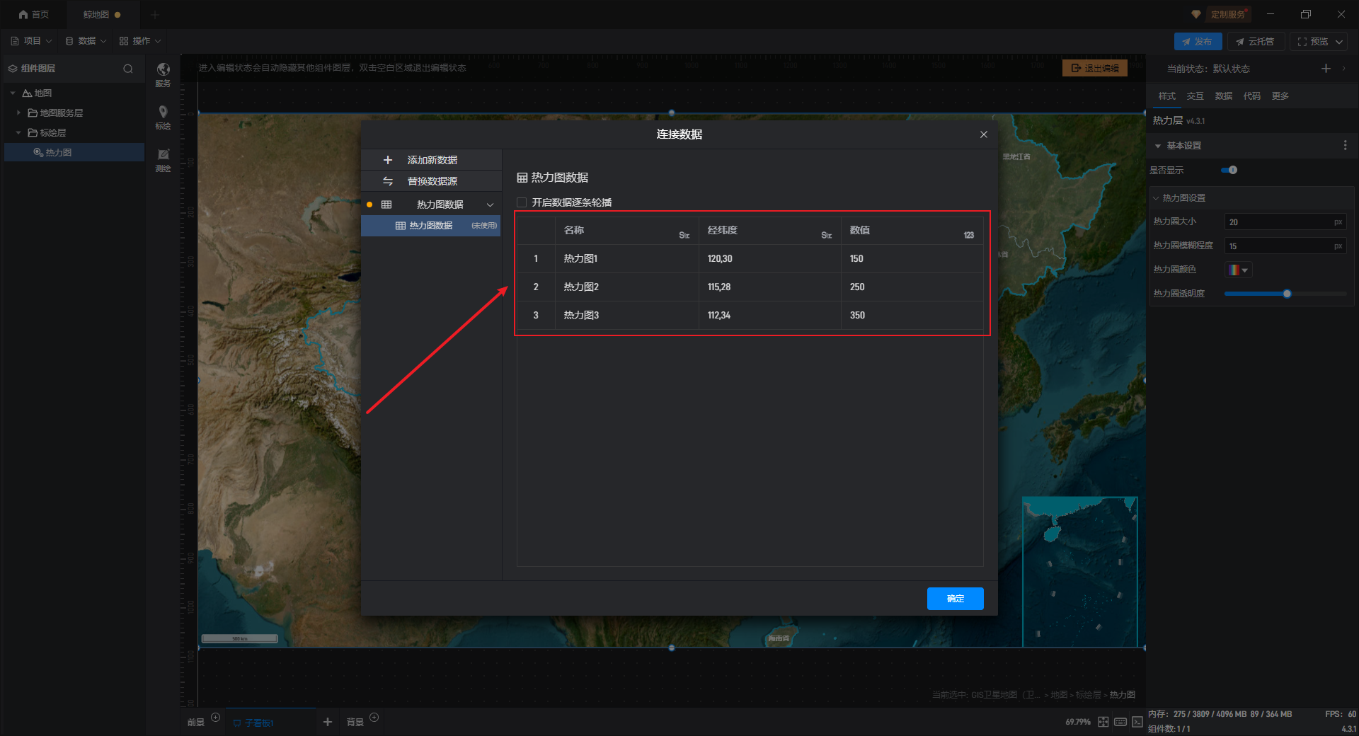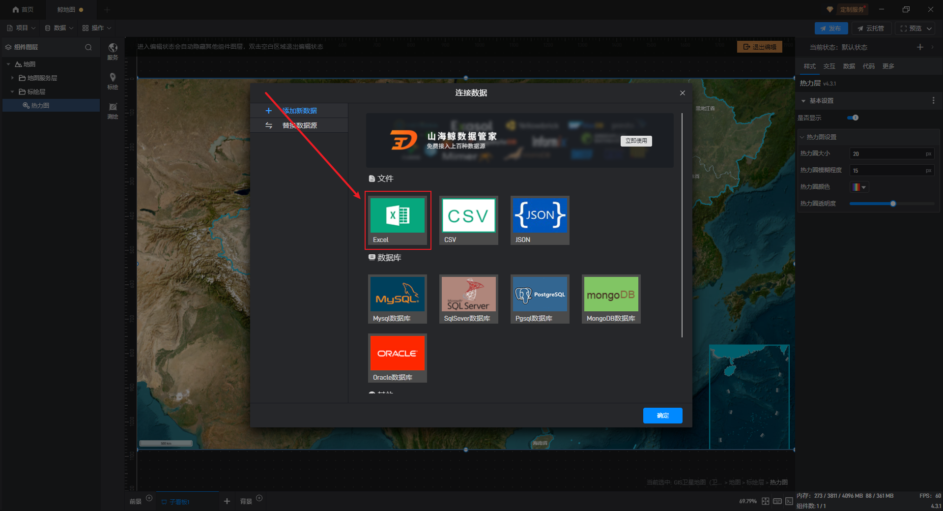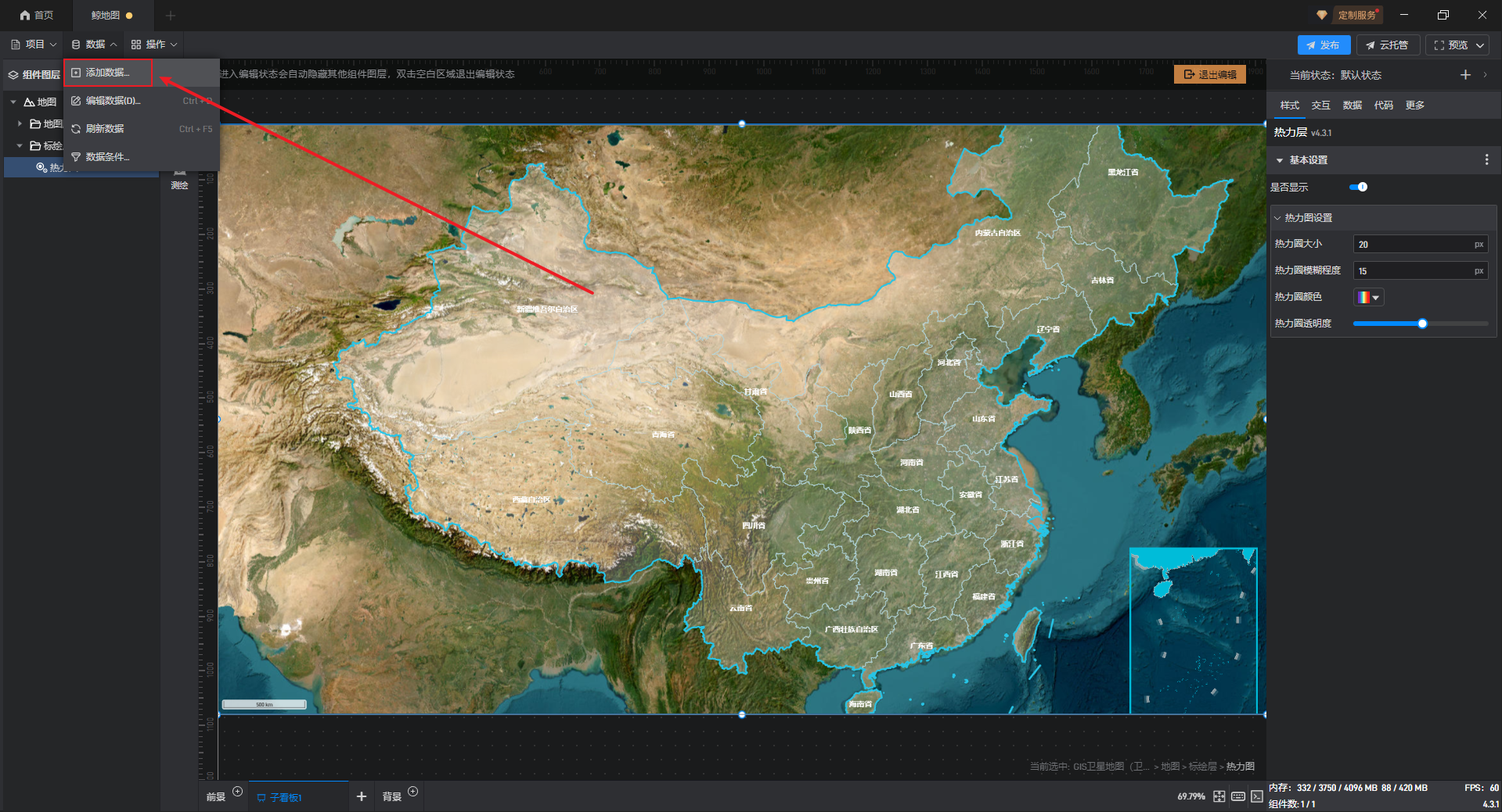 点击左侧菜单栏中的“标绘”,选择“热力图”进行添加,如下图所示:
