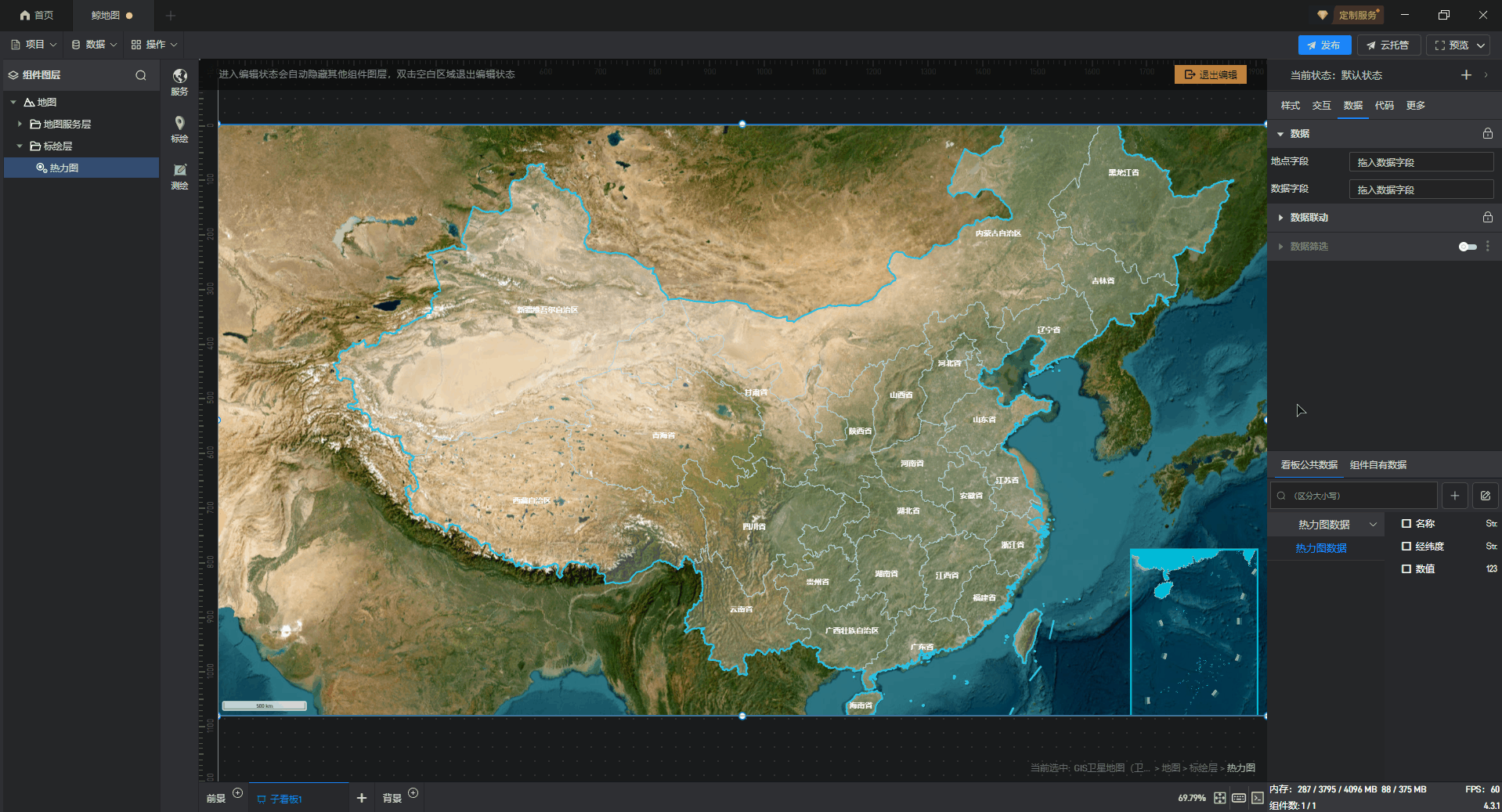 点击选中“热力图”,在右侧“数据”设置窗口中切换到“看板公共数据”(同一个项目中所有数据源是共享的)。