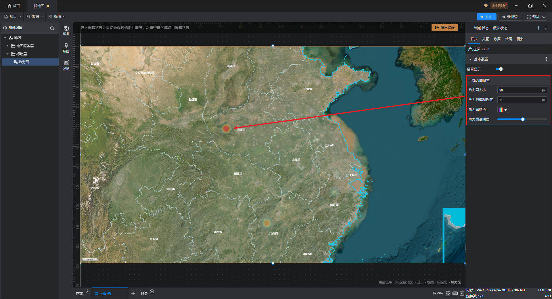 | 热力圈大小 | 自定义设置热力圈的大小,默认值为“20px”,值越大,热力圈的范围也越大。 |