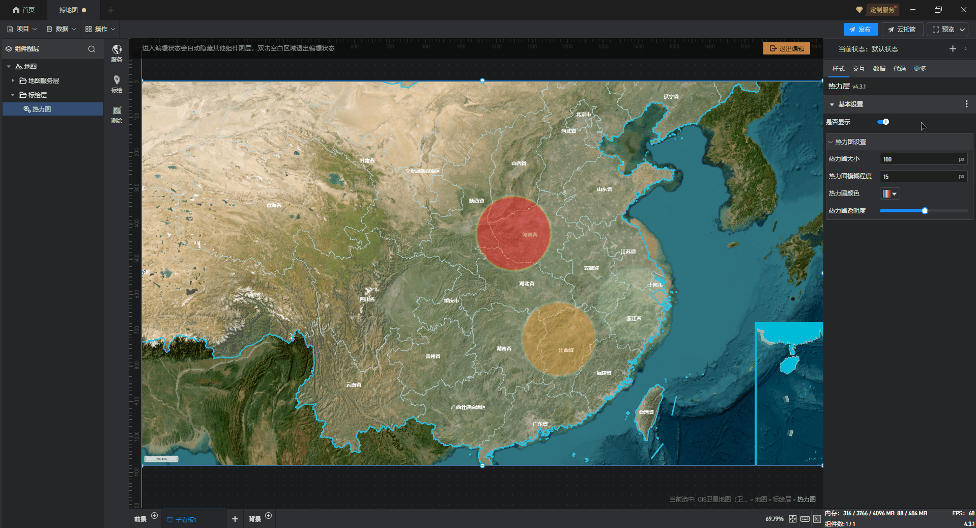 热力图,通过使用颜色编码来显示数据点的密度和分布情况。它能够直观地展示大量数据集中的区域和变化趋势,以帮助我们发现数据中的模式和规律,鲸地图可以在“标绘”中添加“热力图”。